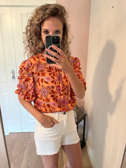 Deze mooie top/blouse is een iets korter model. Op een mid waist broek valt het bij ons model exact op de boord. Met een lage jeans dus ook leuk als Crop top te dragen en op een hoge jeans gewoon als top. Mooie print en heerlijk in dragen. Valt op maat.