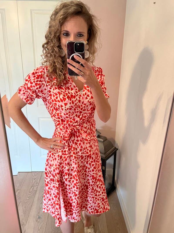 Hoe leuk is deze overslag jurk. Niet alleen de print is mooi maar ook de kleur samenstelling. De jurk valt net op de knie en is daardoor ook mooi qua lengte. Deze jurk gaat in maten en valt op maat.