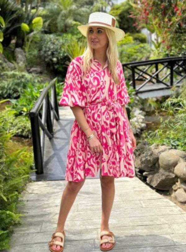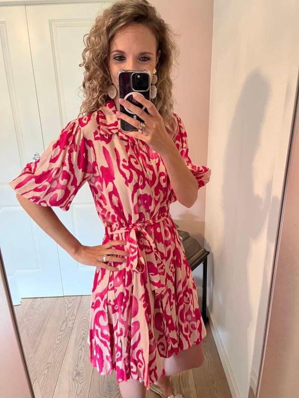 Deze super mooie jurk is volledig doorknoop. De bijgeleverde ceintuur kan er ook af worden gehaald. Mooi met een hak of slippertje te combineren. De jurk gaat in maten en valt op maat