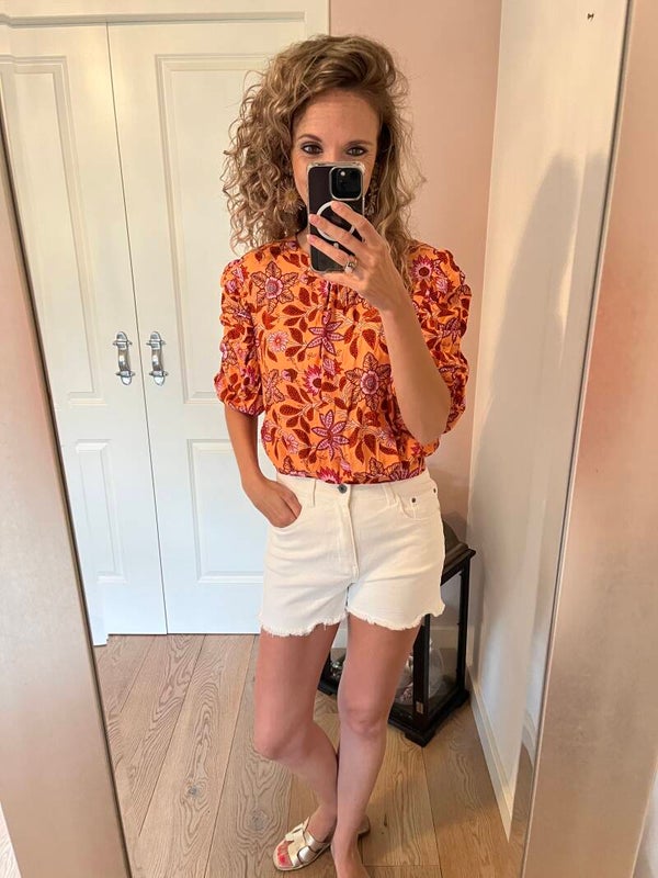 Deze mooie top/blouse is een iets korter model. Op een mid waist broek valt het bij ons model exact op de boord. Met een lage jeans dus ook leuk als Crop top te dragen en op een hoge jeans gewoon als top. Mooie print en heerlijk in dragen. Valt op maat.