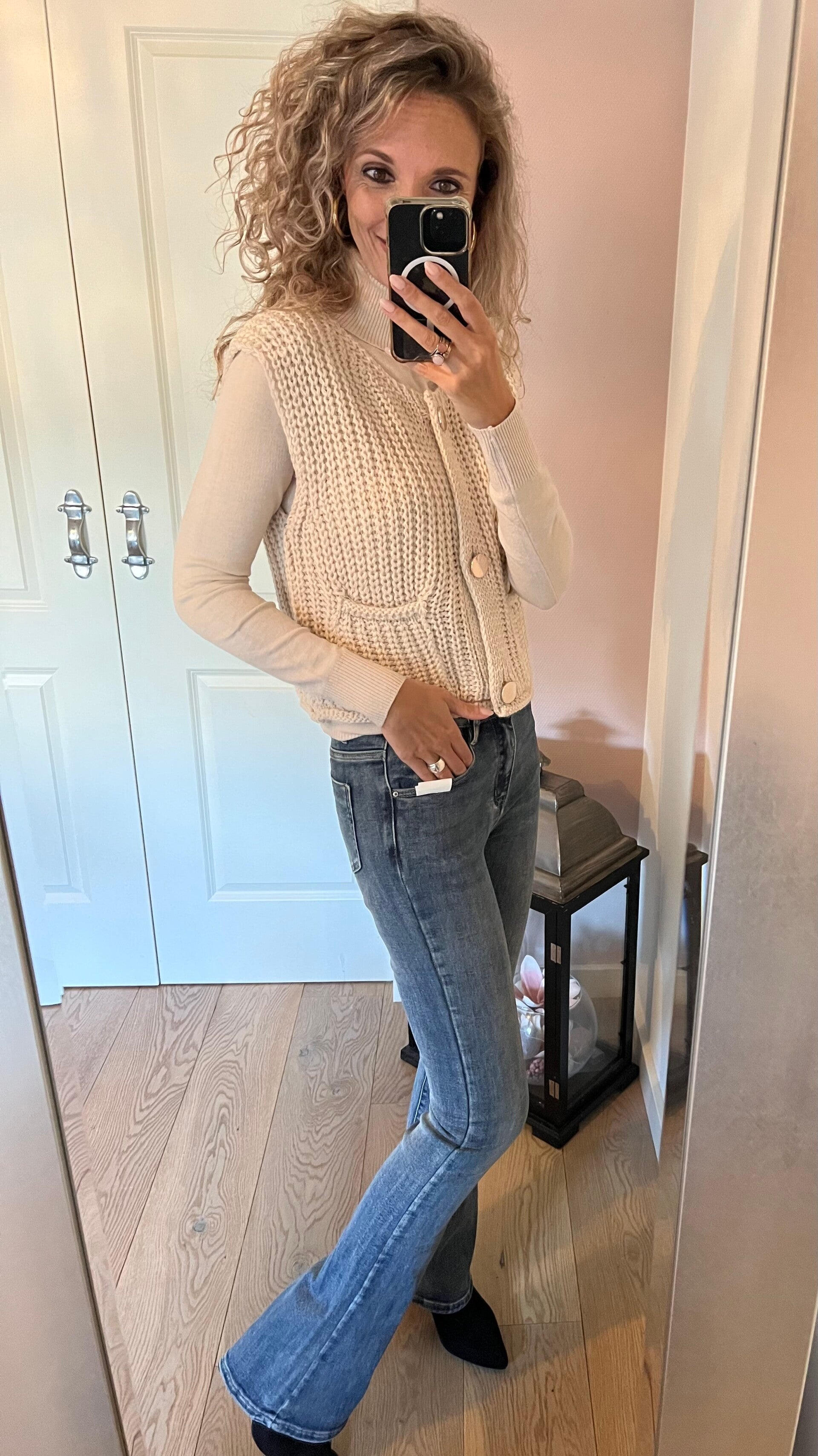 Deze fijne Flared jeans zit tussen een mid waist en high waist in. Valt goed op maat en bevat stretch.