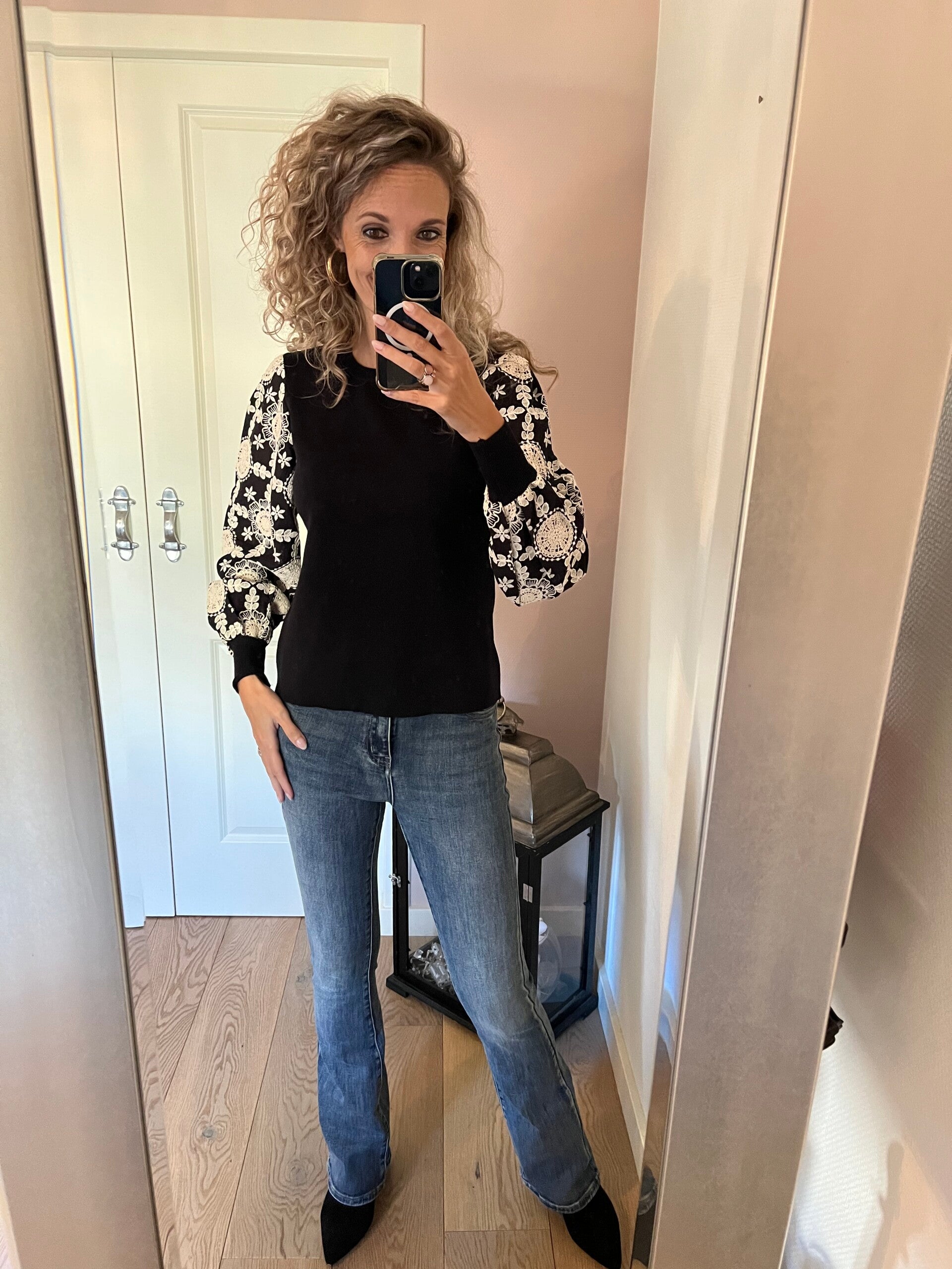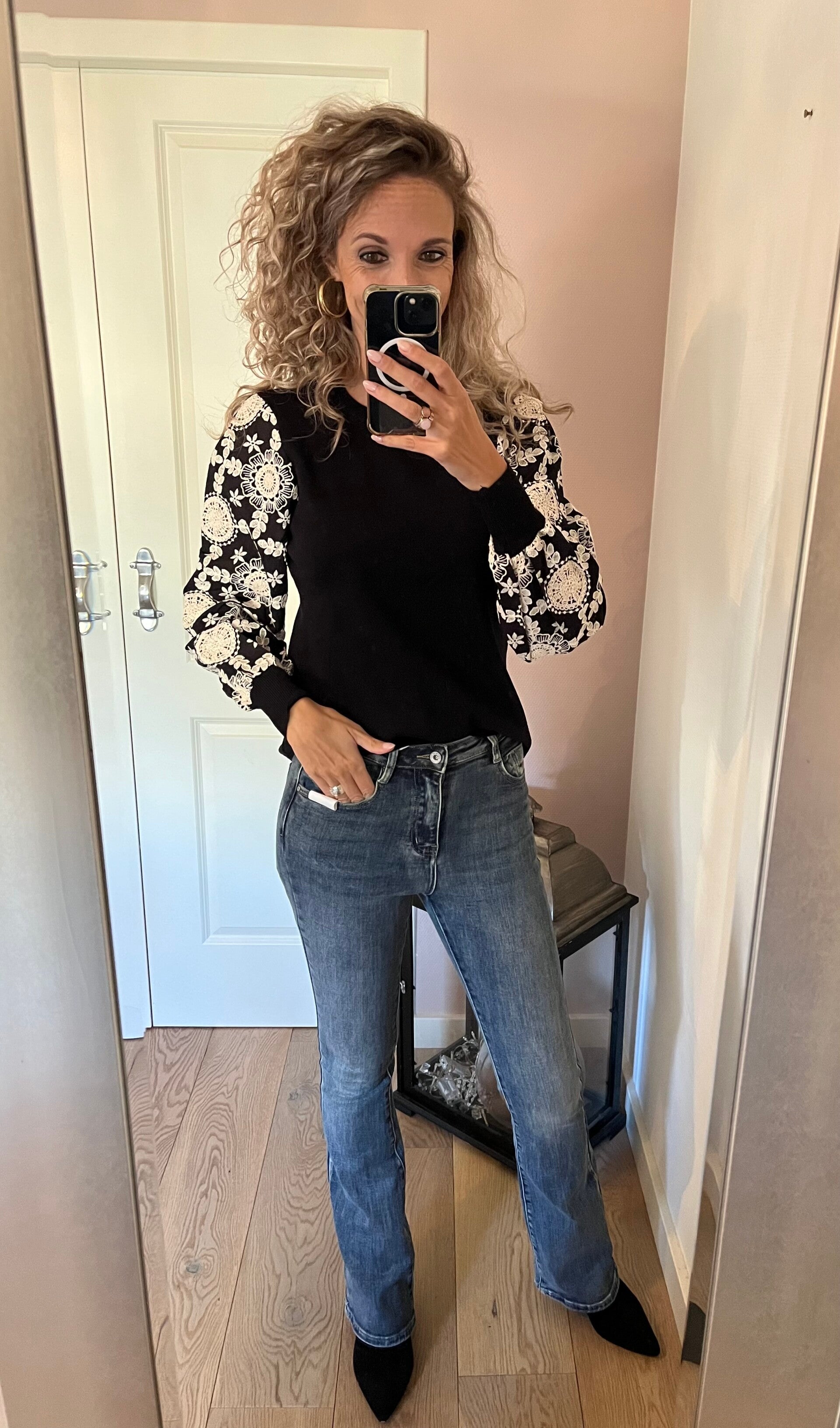 Deze fijne Flared jeans zit tussen een mid waist en high waist in. Valt goed op maat en bevat stretch.