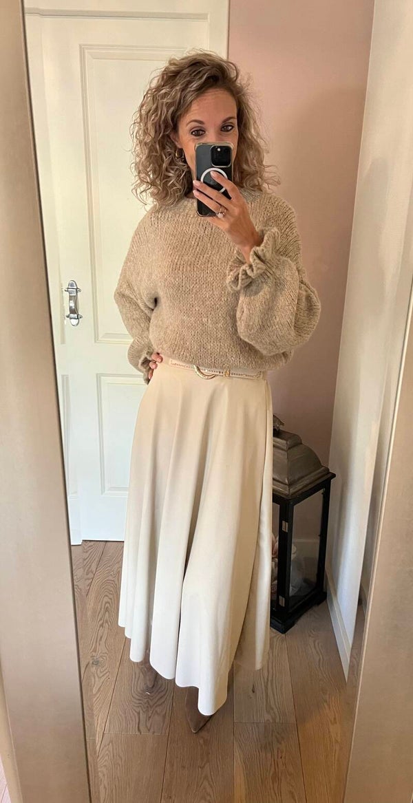 Deze te leuke en zachte trui is mooi grof gebreid en mooie details onderaan de mouwen.