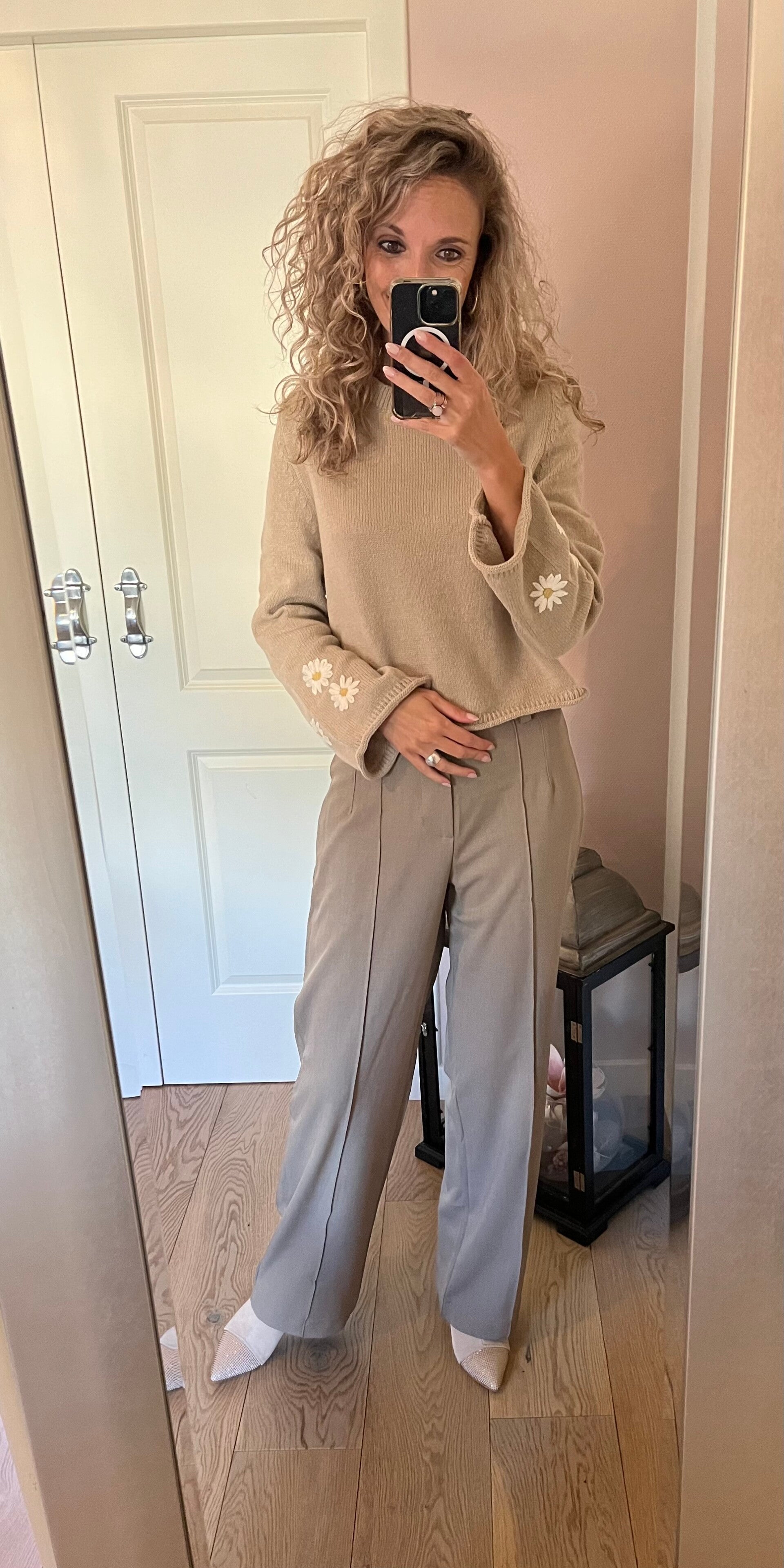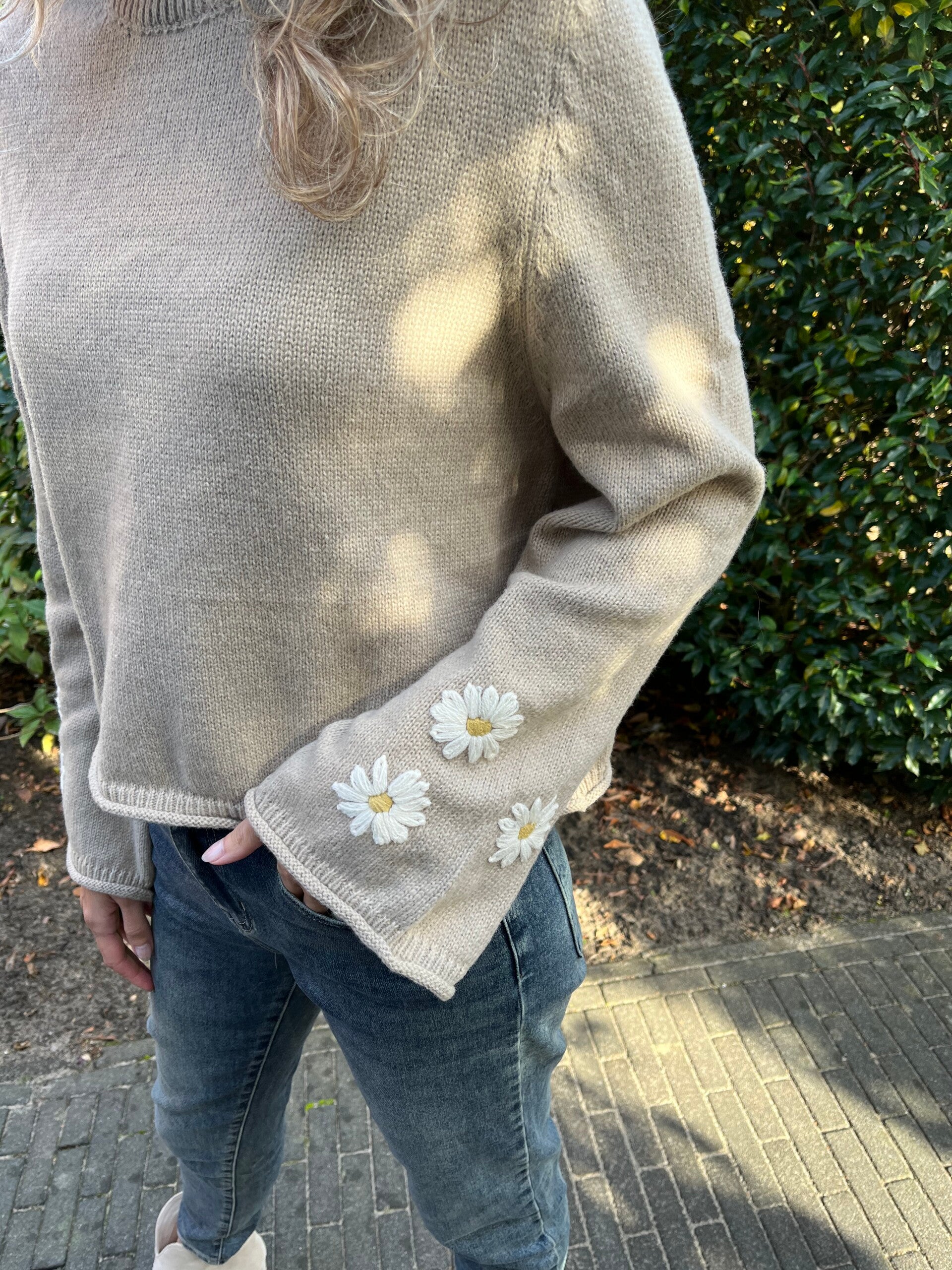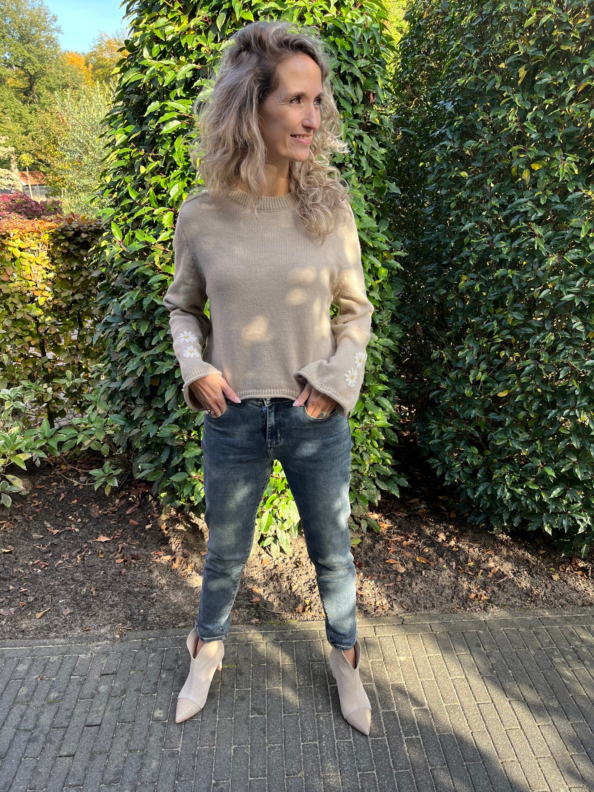 Deze trui is leuk afgewerkt onderaan de mouwen met madeliefjes. De trui gaat in maten en valt ruim.