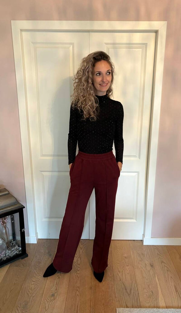 Deze heerlijke broek in de kleur van nu, Bordeaux heeft een elastieken band aan de bovenzijde. Twee steekzakken aan de voorzijde. Deze broek gaat in de maten S/M M/L. Je kan deze broek natuurlijk op tal van manieren combineren. De broek valt op maat.