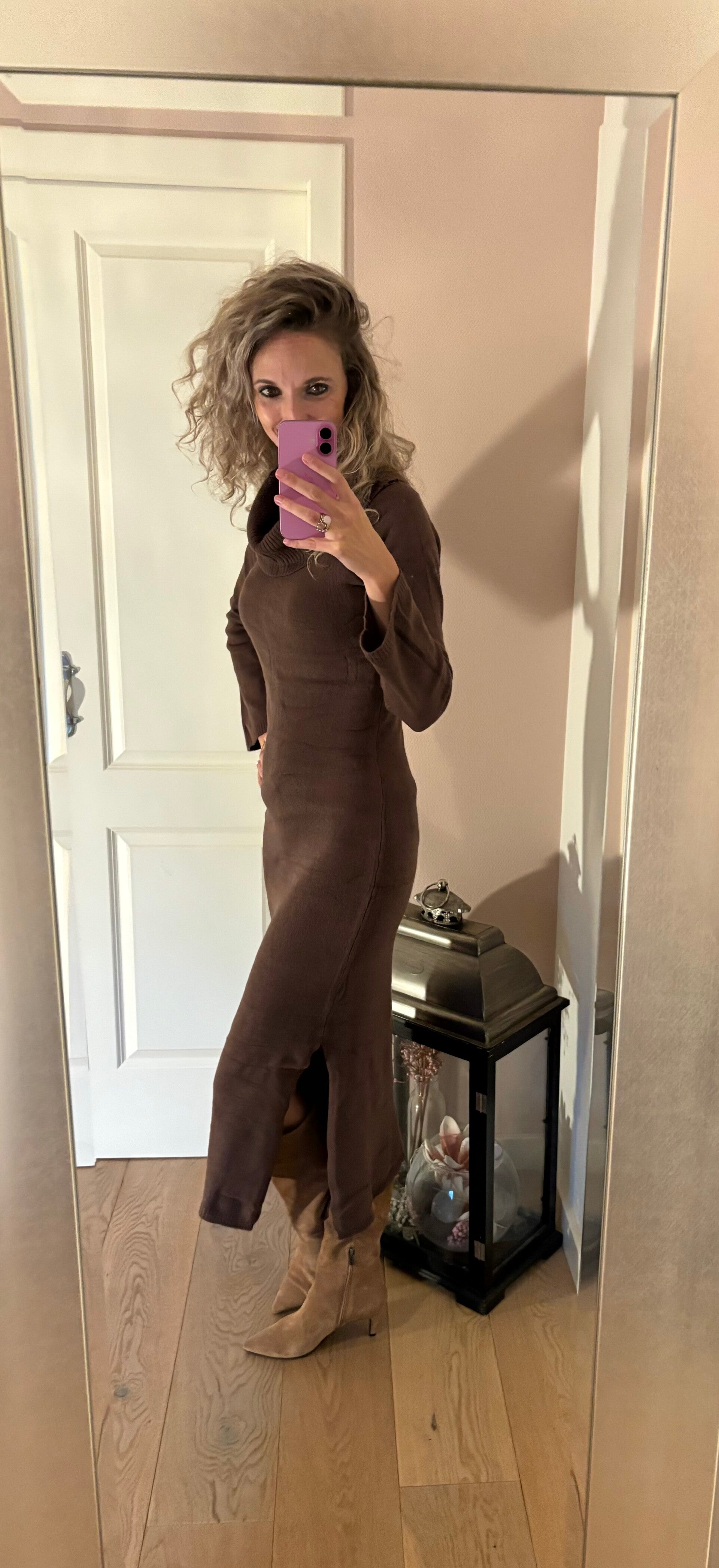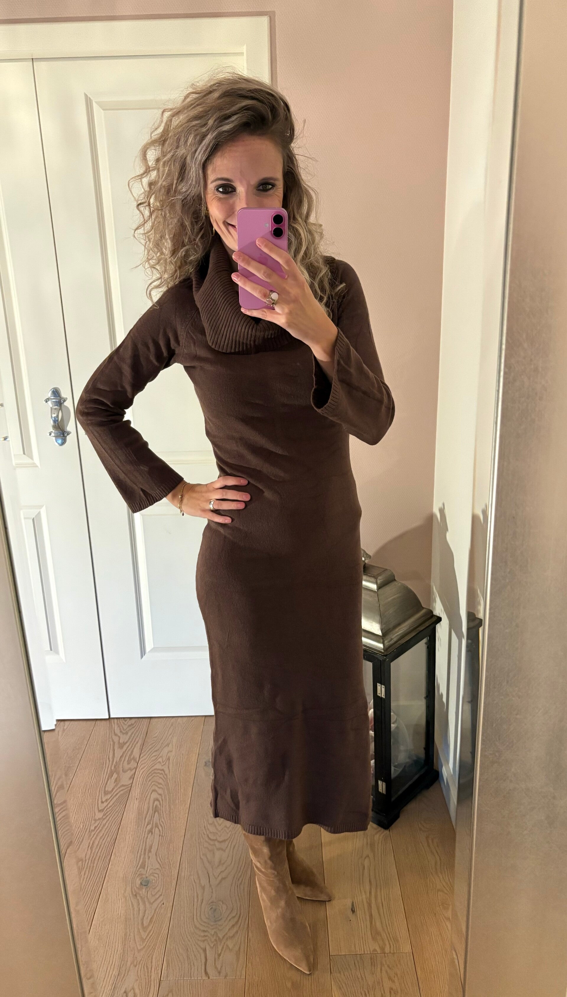 Deze heerlijke hang coljurk is gemaakt van een fijn breisel in de mooie najaarskleur. De jurk heeft aan een kant een split en is one size. Te dragen van maat 34/40
