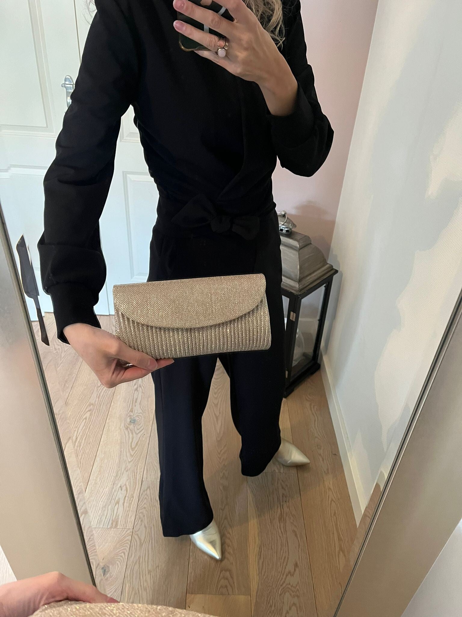Hoe gaaf is deze clutch in de mooie kleur champagne. Mooi om je outfitje mee af te maken. Zit een lang hengsel bij in.