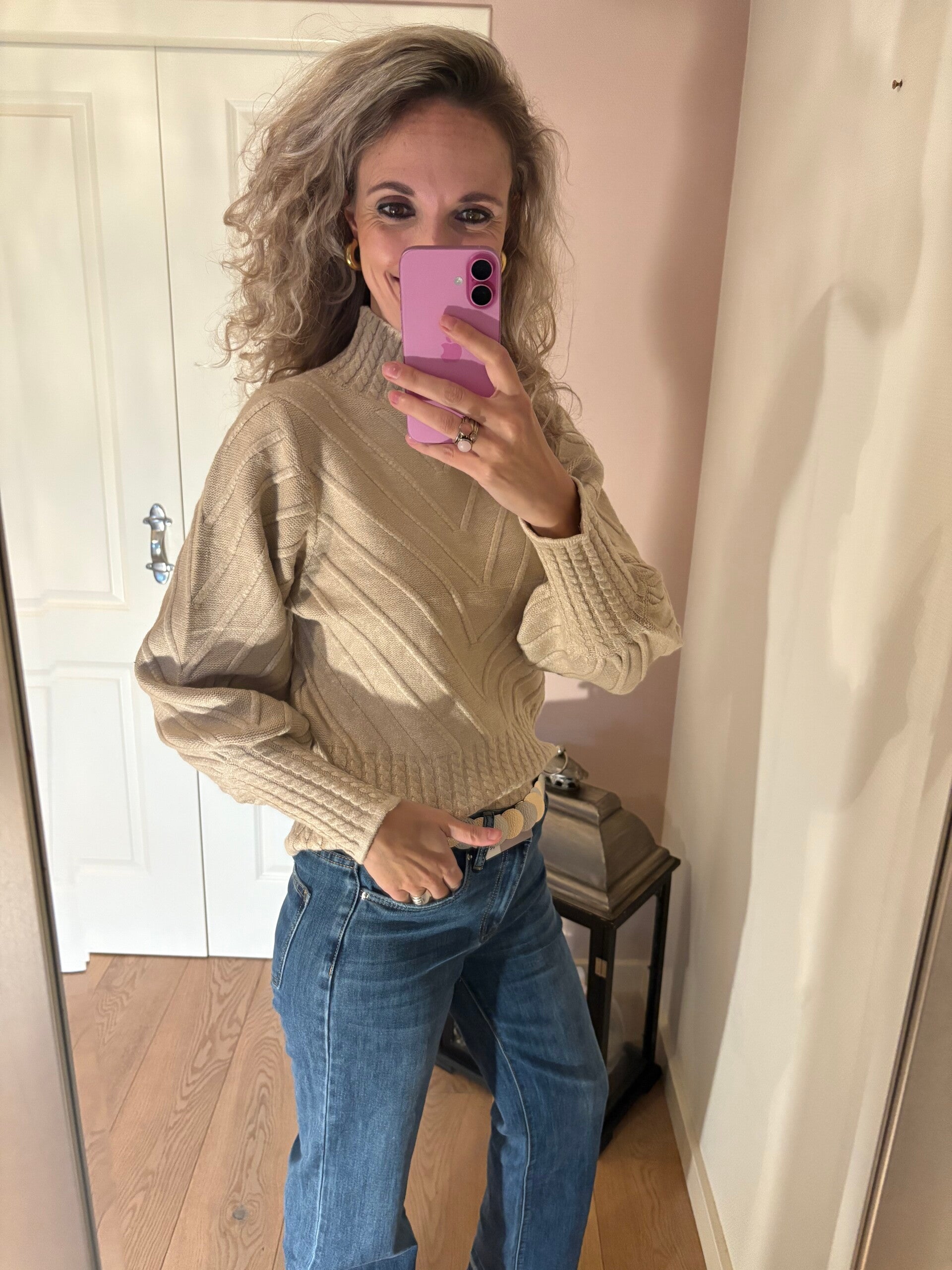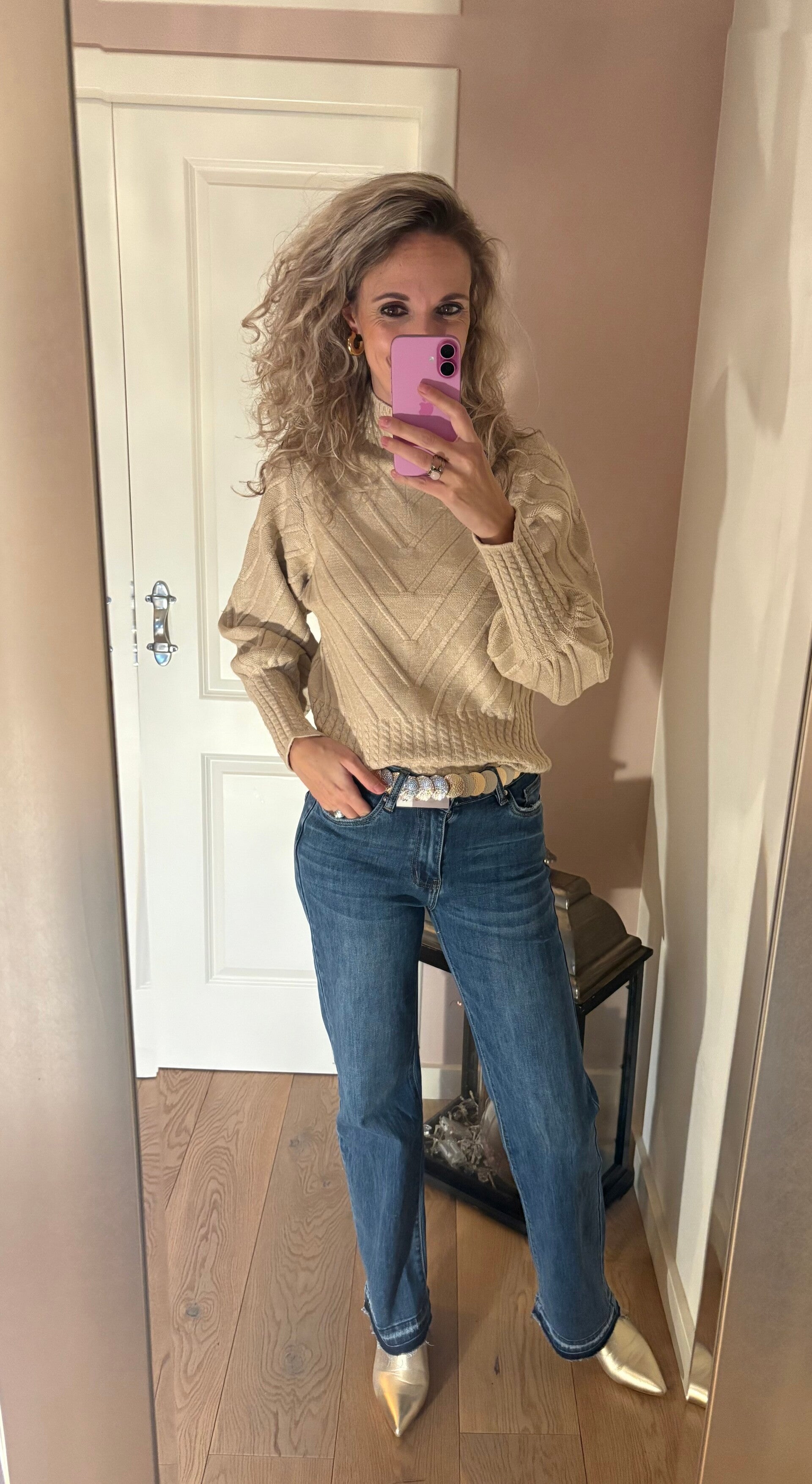 De jeans gaat in de maten XS/XL en valt op maat.