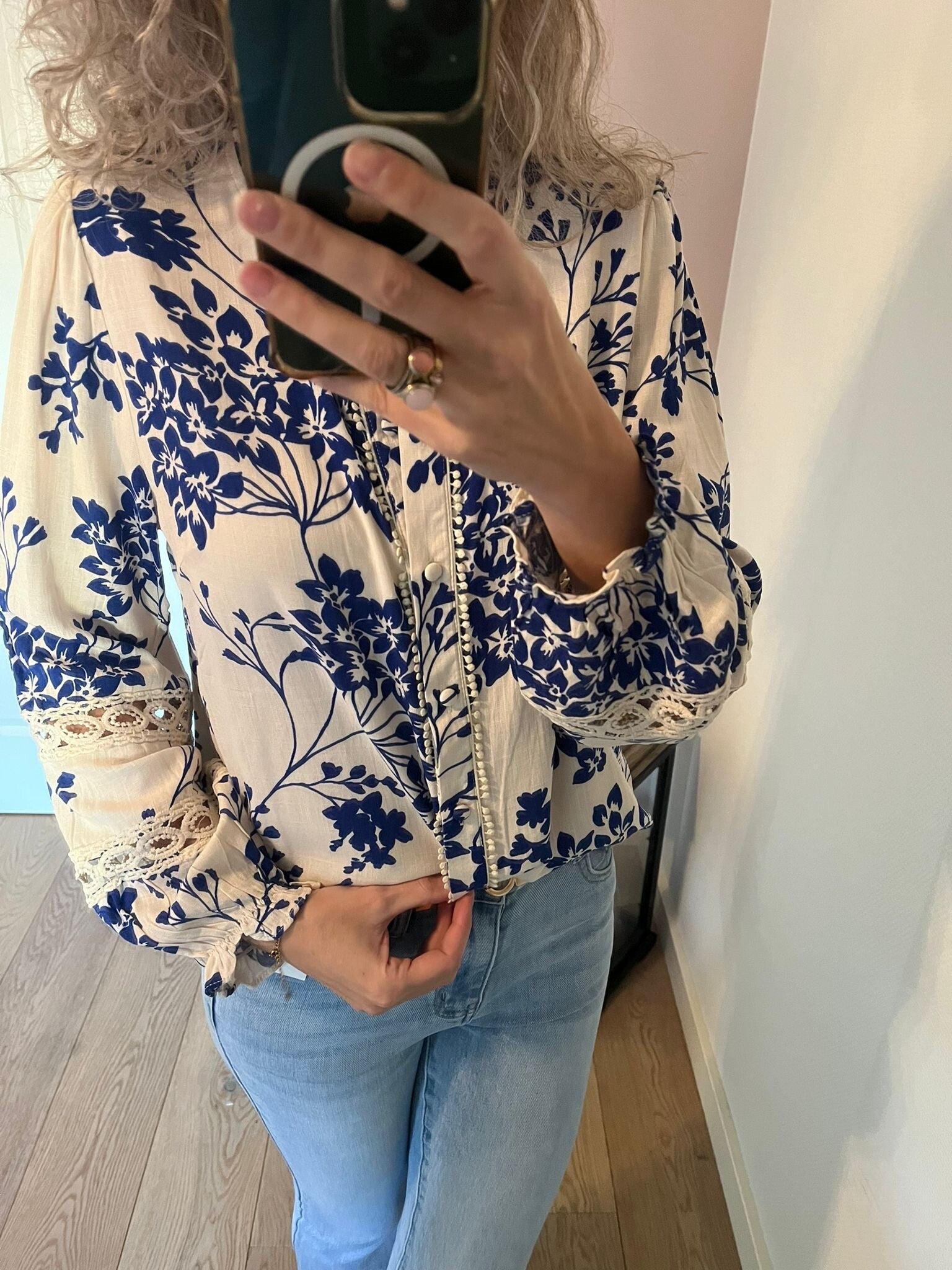 Deze mooie blouse gaat in maten en valt iets ruimer. Ons model draagt haar eigen maat, maat S