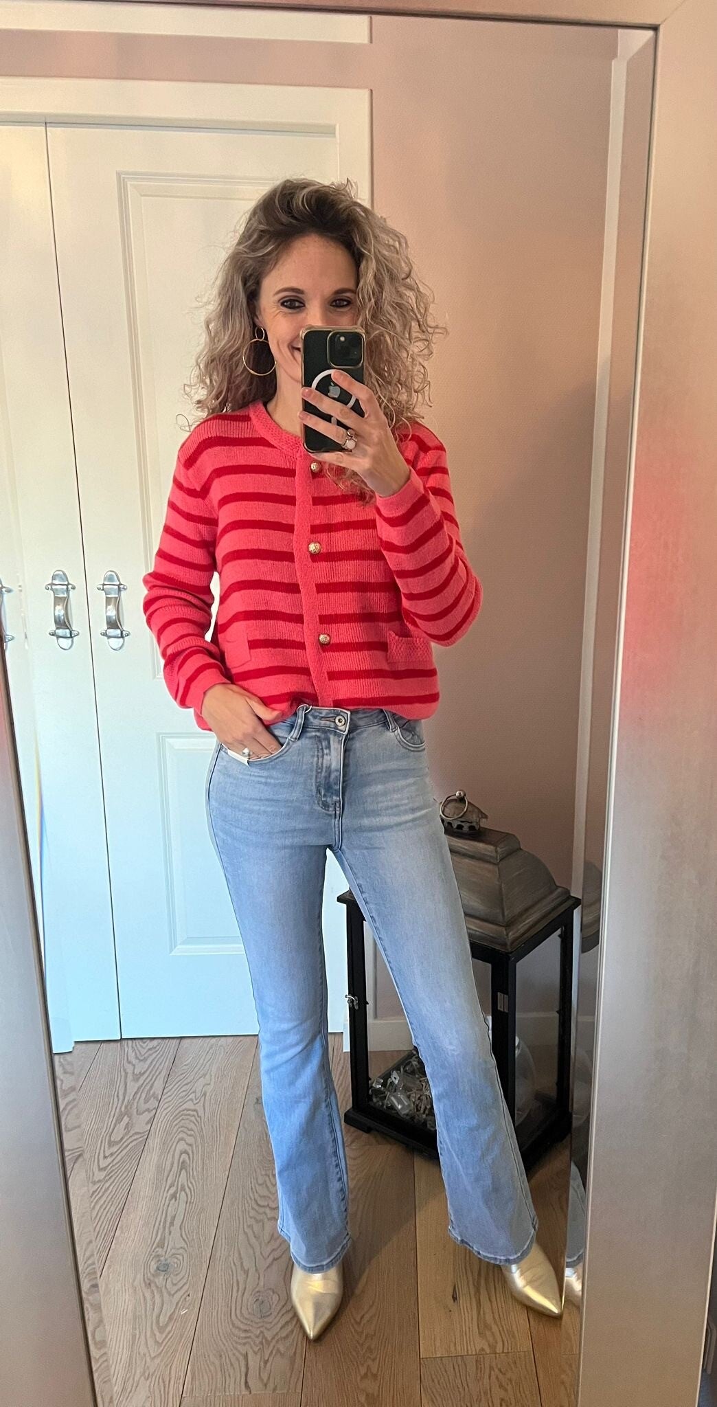 Vest Roze met rode streep en gouden knoopjes. One size en dicht te dragen t/m maat 40, open t/m maat 42