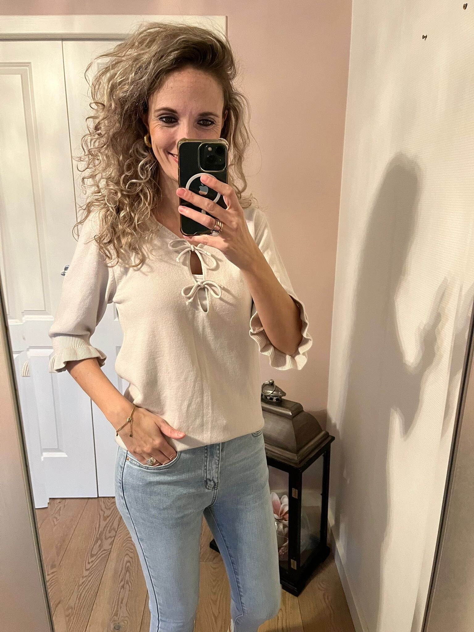 Deze fijne jeans van het merk Folyrose draagt heerlijk door de stretch. Het model zit tussen een mid en high waist in en valt goed op maat. Ons model is 1.73 cm
