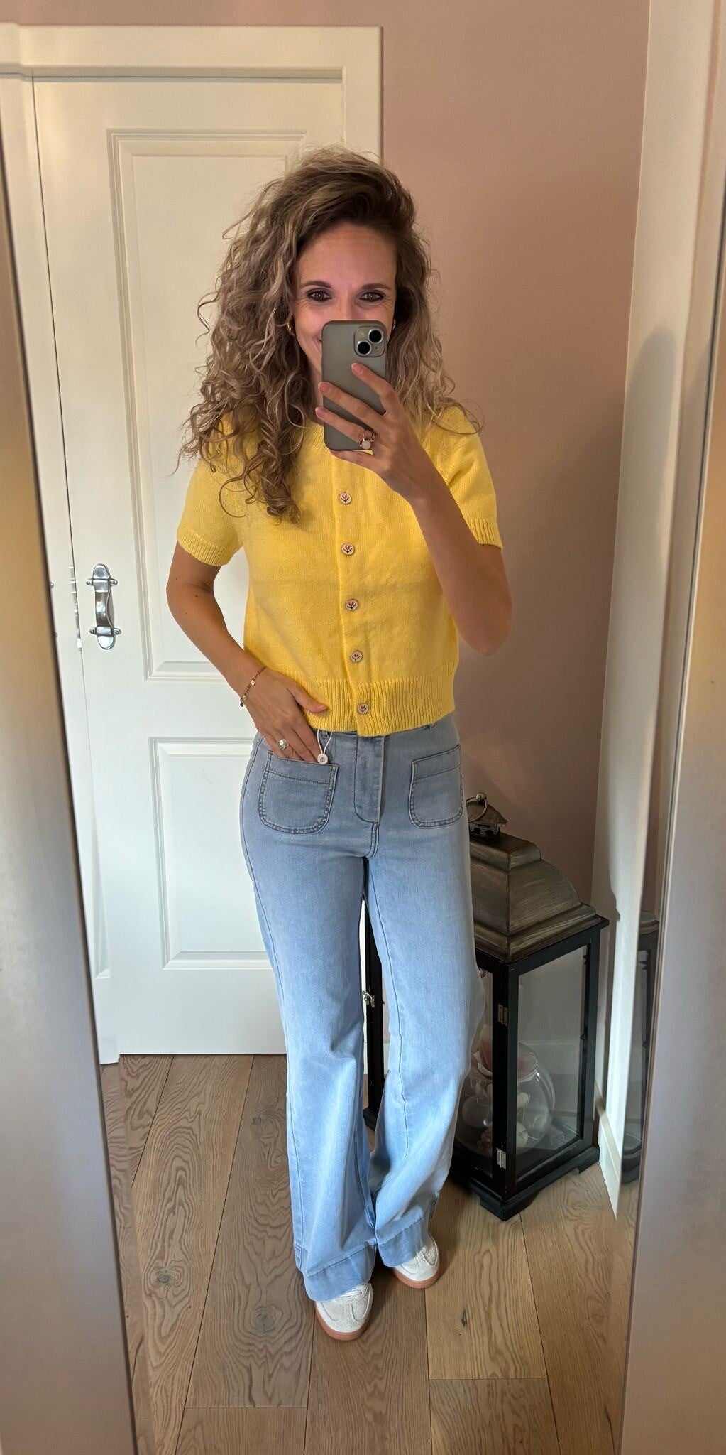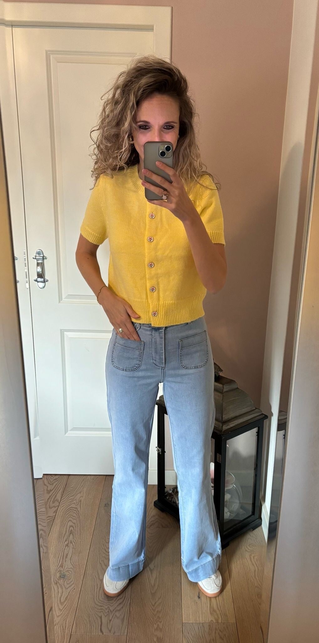 Dit lieve vestje in de mooie kleur geel heeft tulpen knoopjes. Hoe leuk om te dragen op een jeans of witte broek!