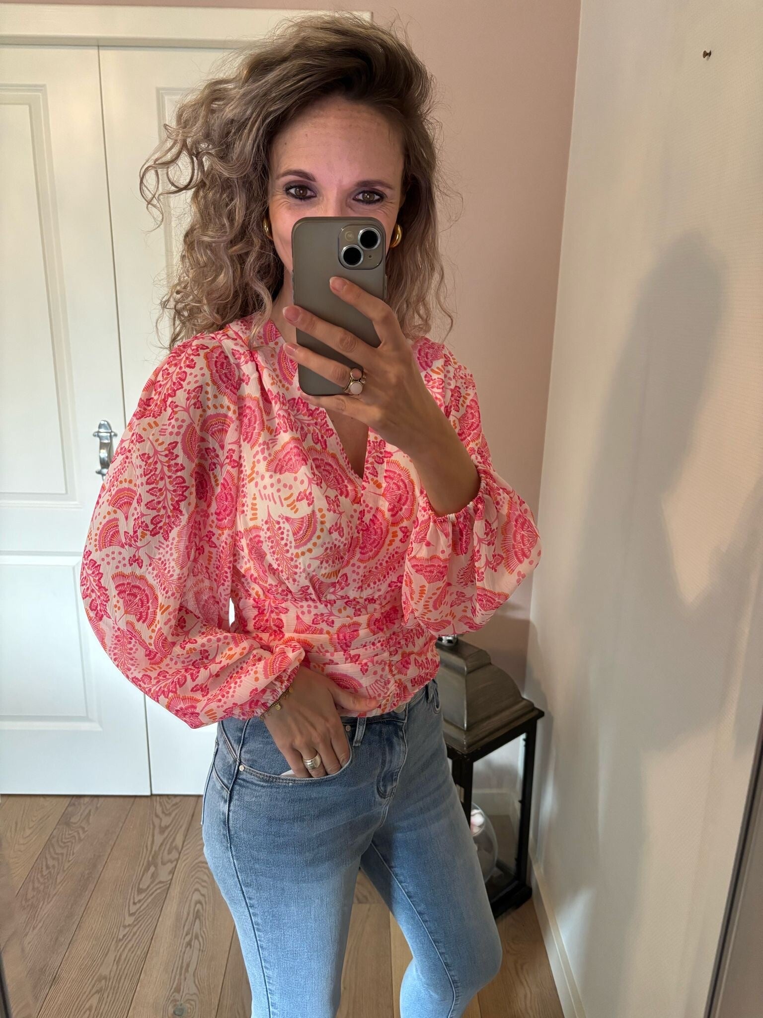 Deze mooie blouse gaat in maten. Ons model draagt haar eigen maat