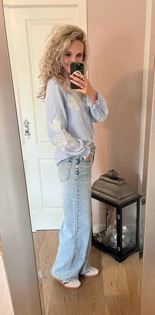 De jeans valt op maat, ons model draagt haar eigen maat, maat S en is 1.73 cm