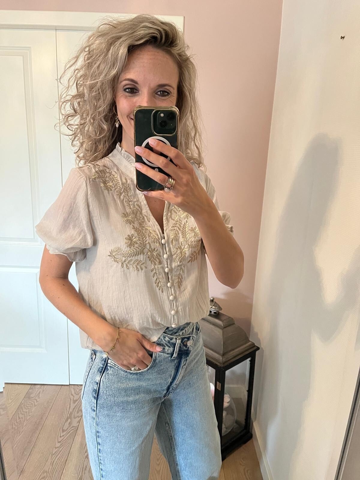 Deze mooie blouse is afgewerkt met gouden lurex. De blouse valt op maat