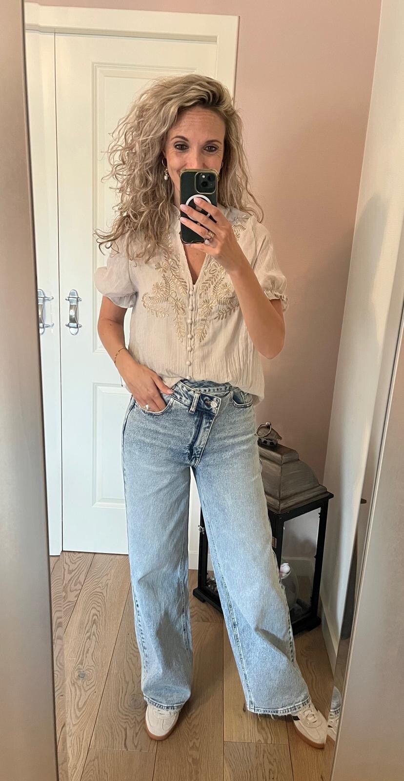 Deze gave jeans met asymmetrie knoopsluiting aan de voorzijde is de trend van dit moment. De mooie wassing in het wide leg model maken het compleet.