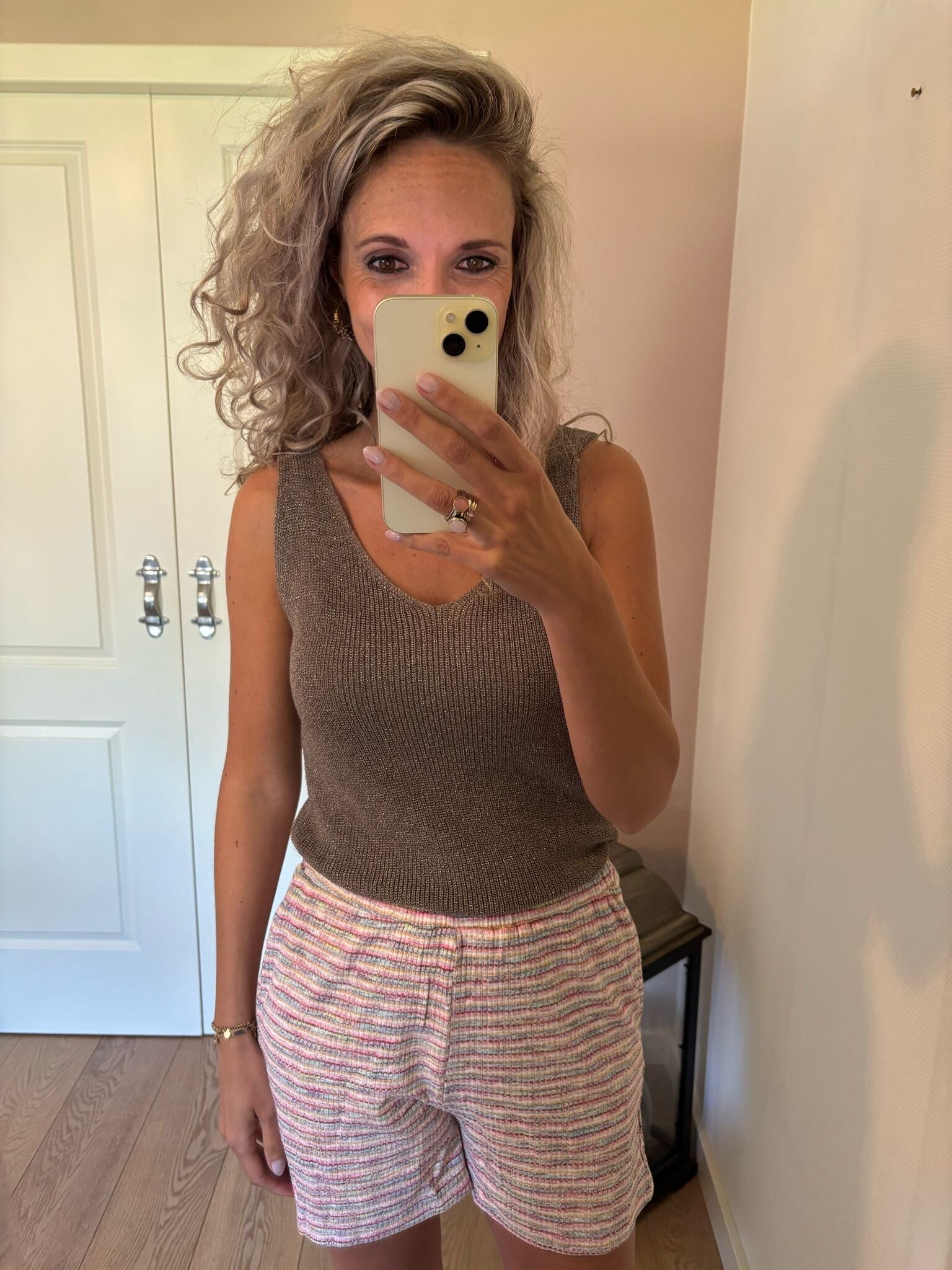 Deze heerlijke broek in de nieuwste najaarskleur van nu, bordeaux heeft een elastieken band aan de bovenzijde. Twee steekzakken aan de voorzijde. Deze broek gaat in de maten S/M M/L.