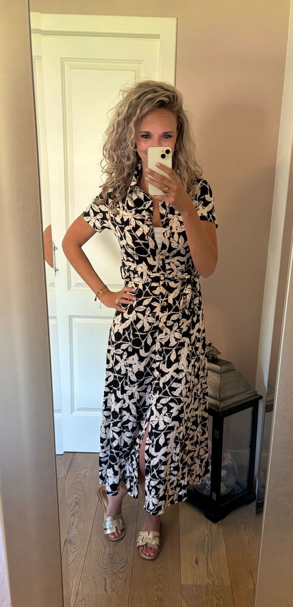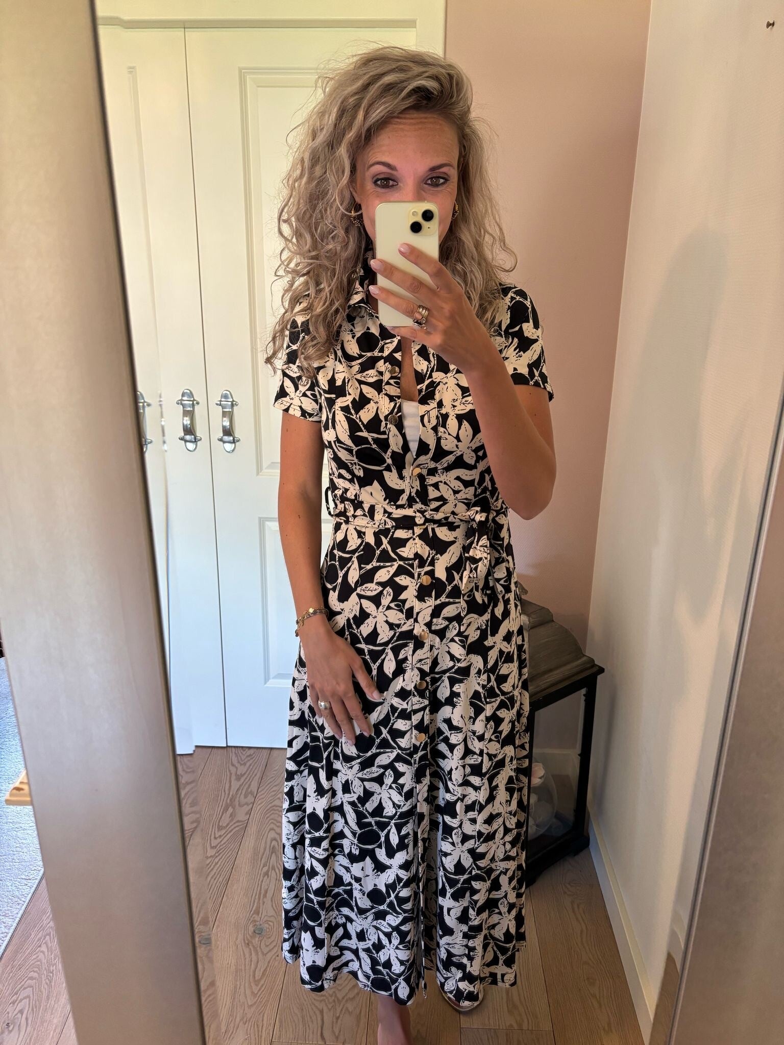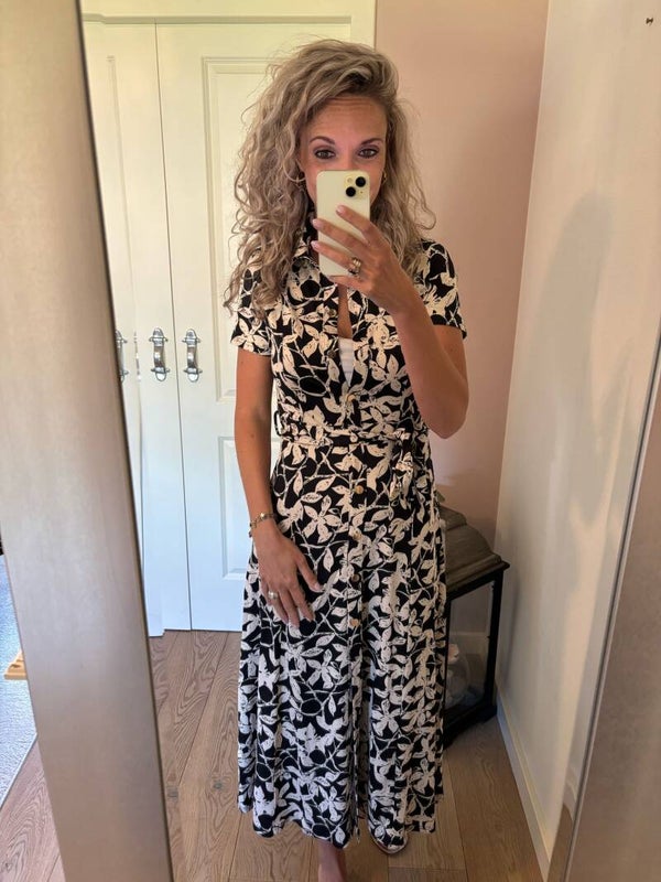 Deze mooie print jurk in de kleur zwart/beige is van travel gemaakt. Dat draagt natuurlijk heerlijk. Ons model draagt haar eigen maat.