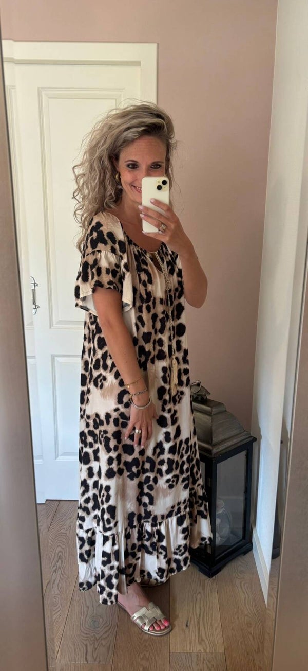 De jurk gaat in maten T1 T2 T3 en valt ruim