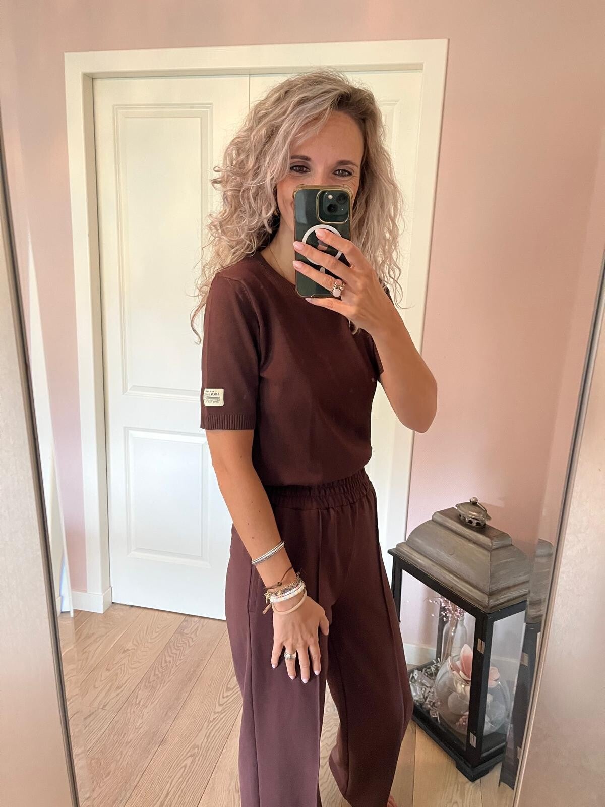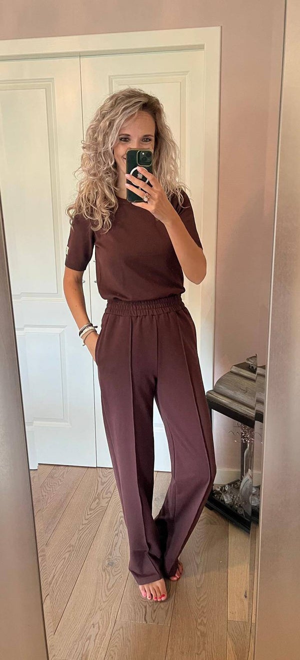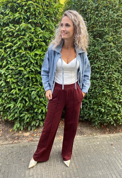 Deze heerlijke broek in de nieuwste najaarskleur van nu, bordeaux heeft een elastieken band aan de bovenzijde. Twee steekzakken aan de voorzijde. Deze broek gaat in de maten S/M M/L.