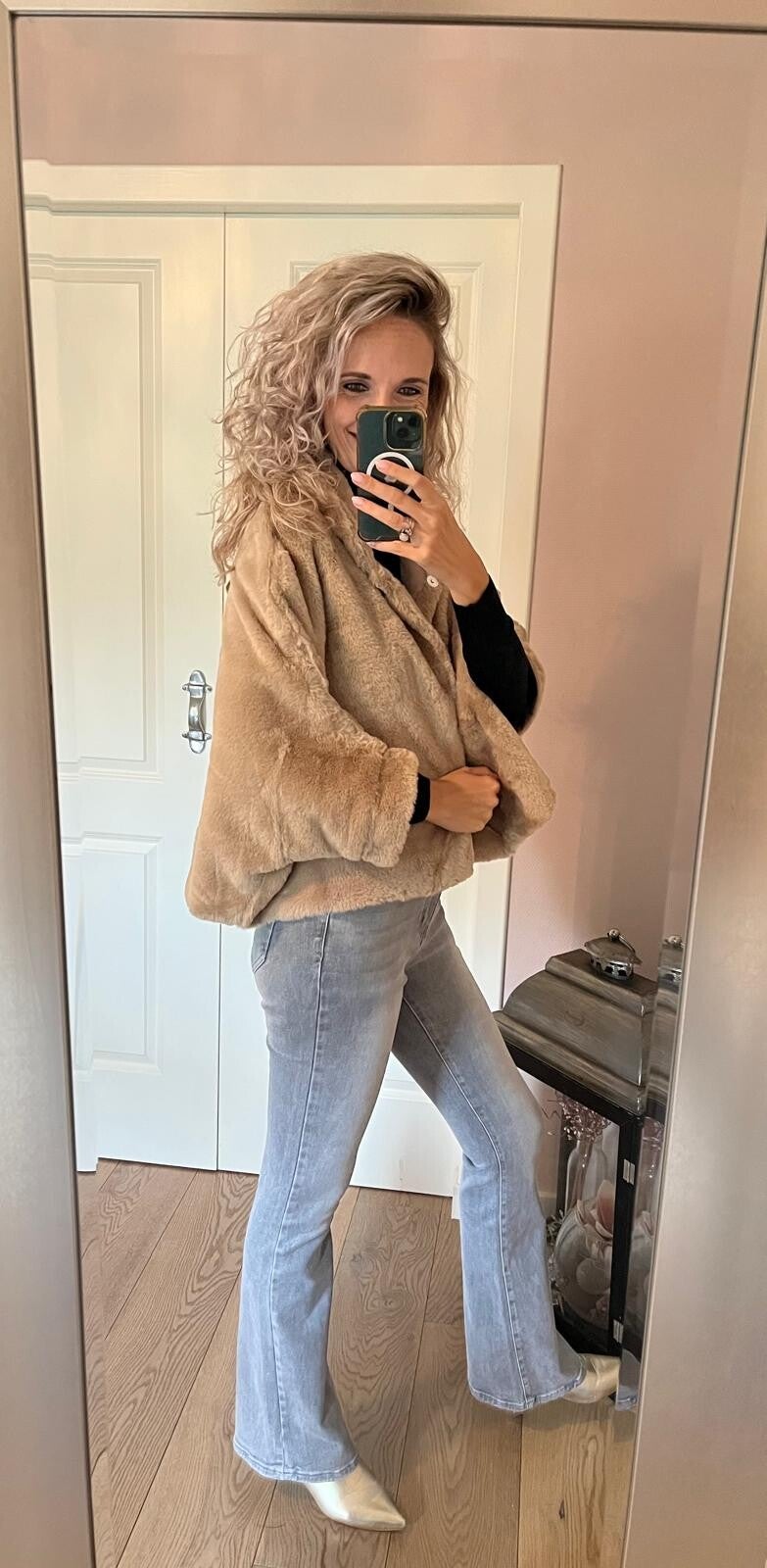 Dit faux fur jasje in uitlopend lijntje met korte aangeknipte mouw is super chique voor het najaar.