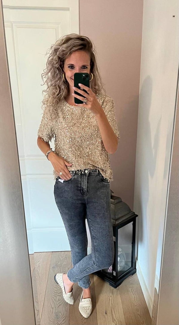 Deze mooie top met subtiele pailletten is natuurlijk mooi om te dragen met een feestje maar ook zeker leuk voor op een jeans. De top is gevoerd waardoor het fijn draagt. Ons model draagt haar eigen maat, maat S