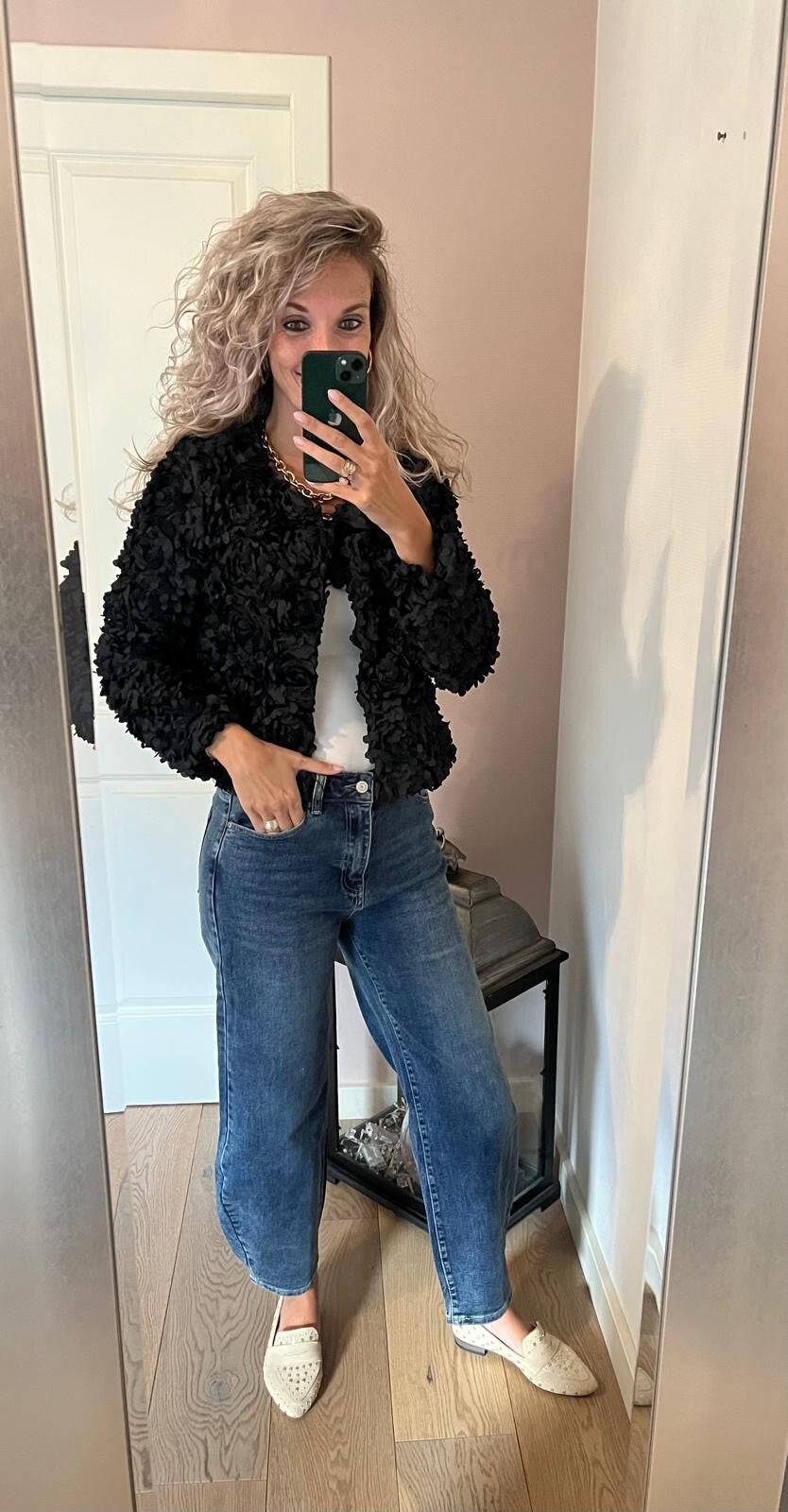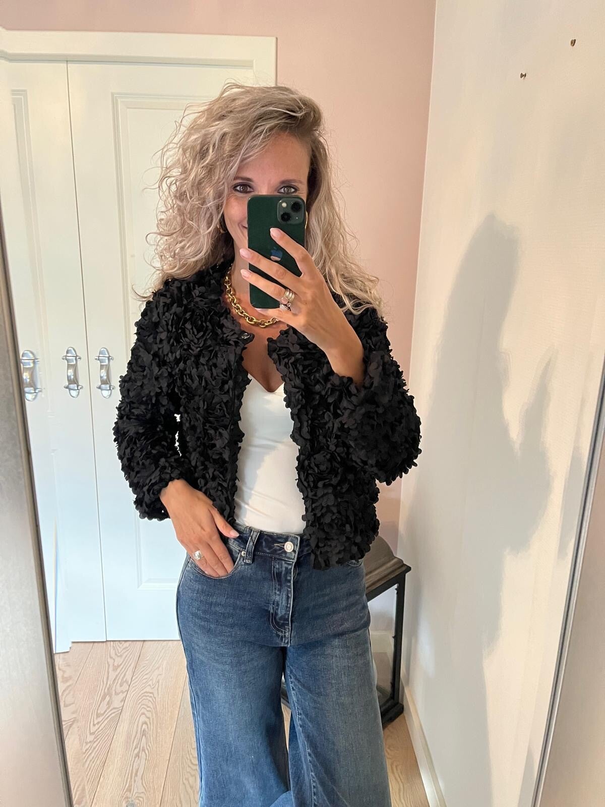 Dit super gaaf uitgewerkte jasje is perfect voor een feestje maar ook super tof om het op een jeans te dragen. Aan de bovenzijde zit een drukknoop waardoor je het ook deels dicht kan dragen. Het jasje is gevoerd van binnen waardoor het ook nog eens fijn draagt