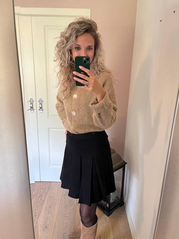 Ons model is 1.73m en draagt maat S/36, haar eigen maat.
