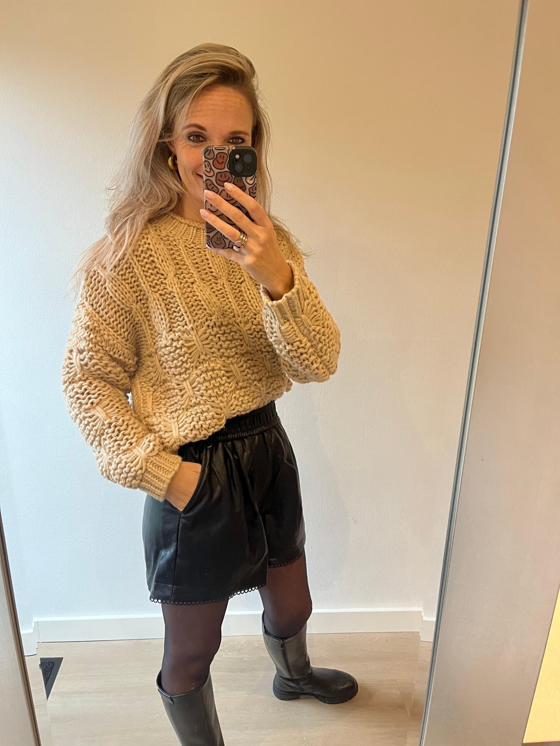 Ons model is 1.73m en draagt maat S/36, haar eigen maat.