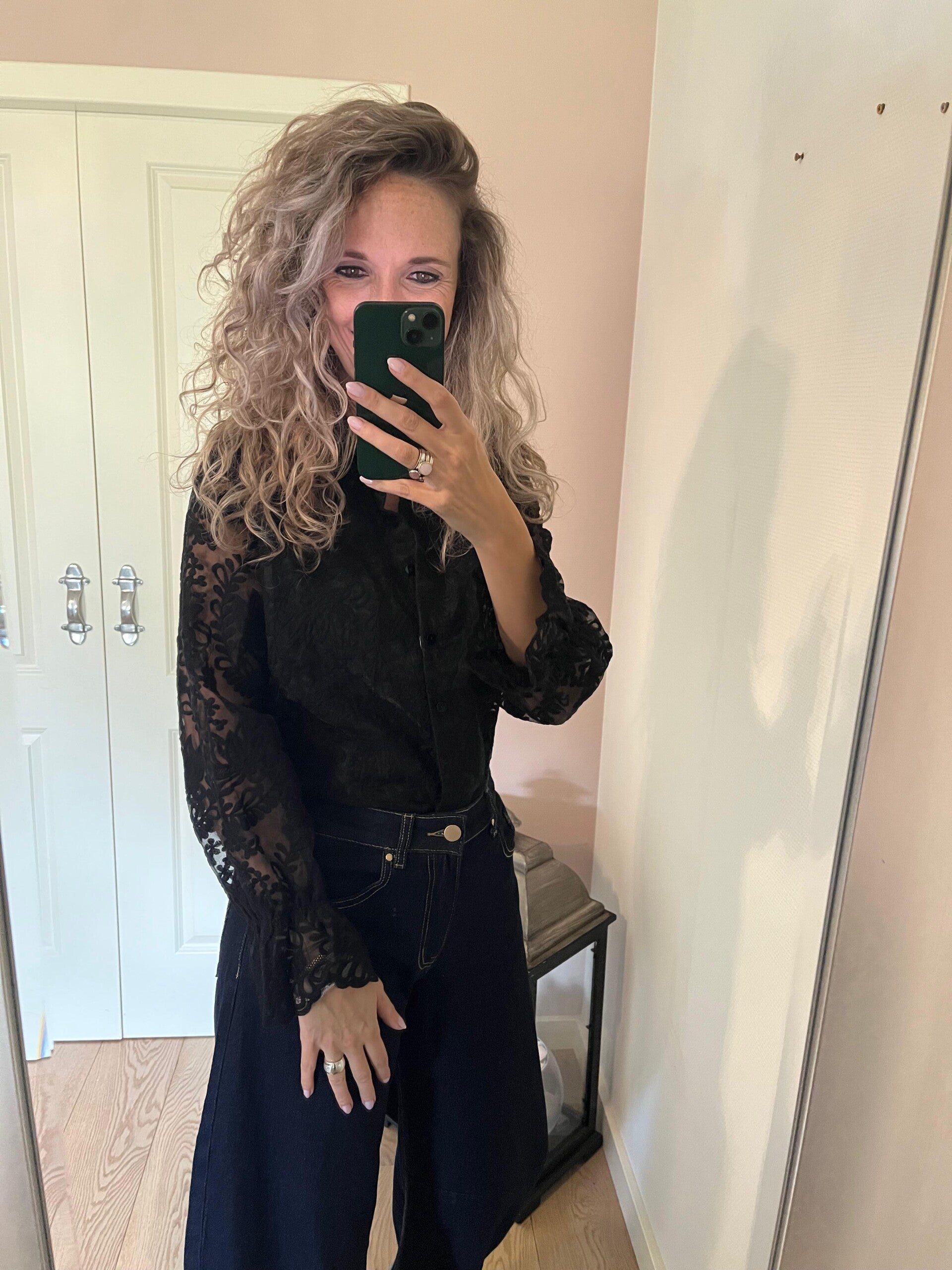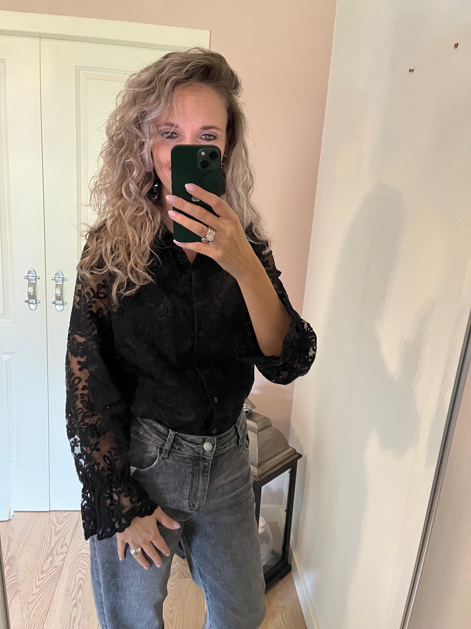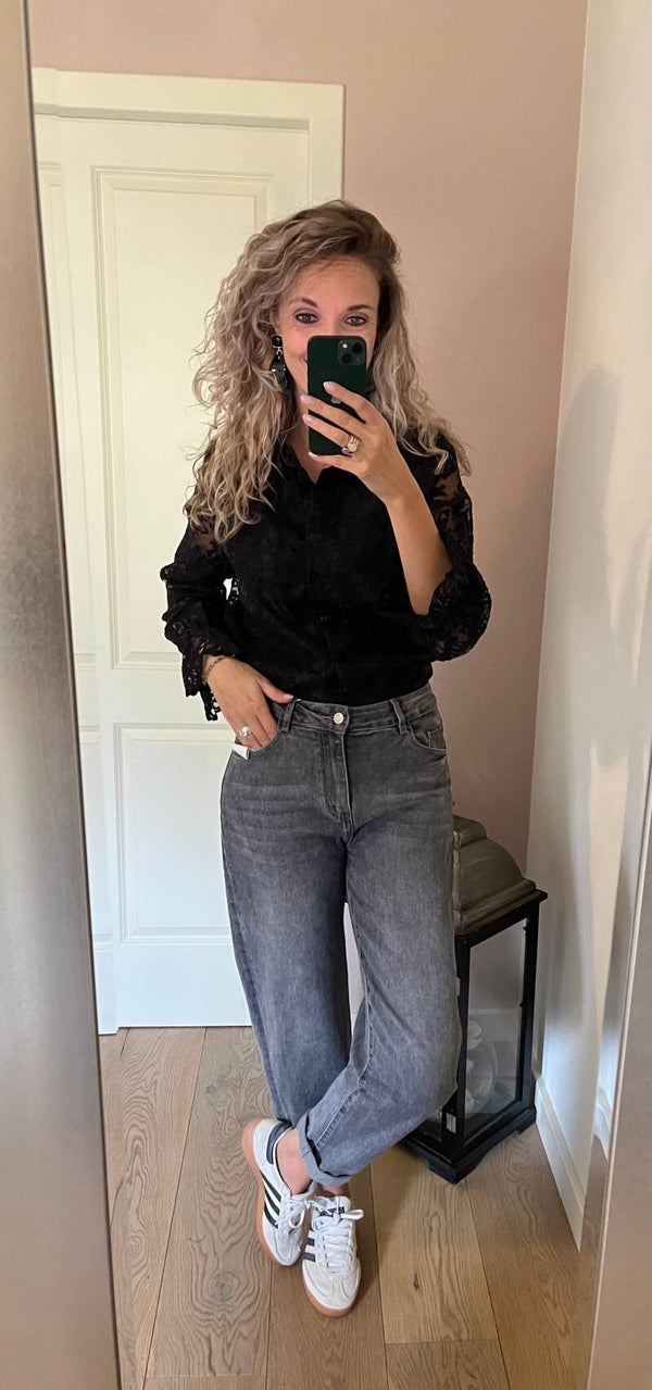Deze mooie kanten blouse gaat in maten en valt op maat. Het tussen stuk van de blouse is fijn gevoerd.