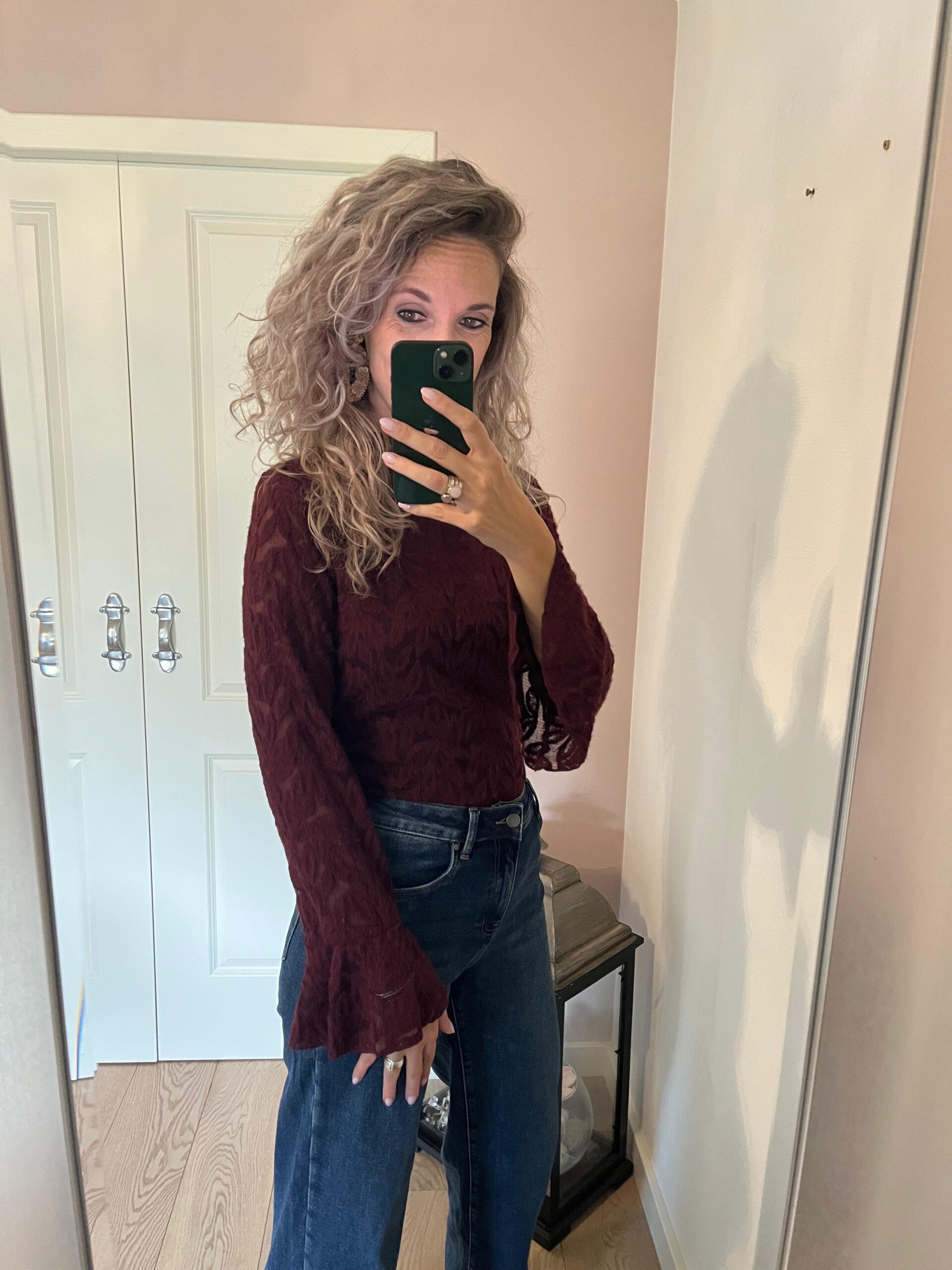 Deze mooie kanten top met uitlopende mouw mag niet uit jouw garderobe ontbreken. Deze kanten top hebben we in verschillende kleuren.
