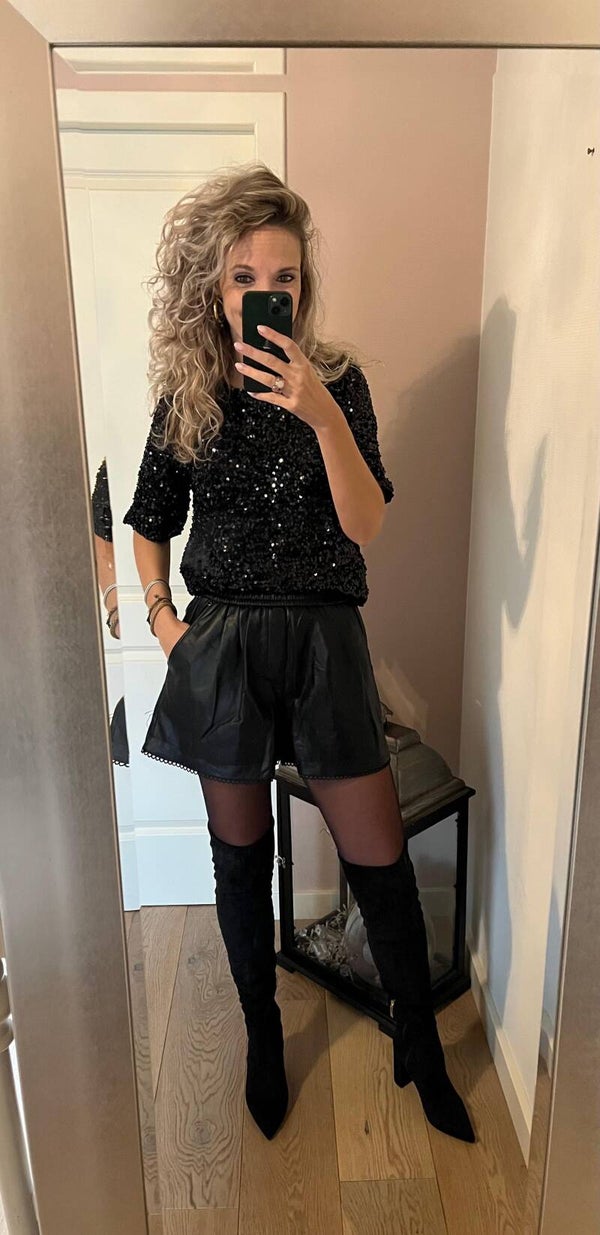 Hoe gaaf is dit shortje. Leather look, twee steekzakken, elastiek in de taille. Gaaf met een ruime sweater maar ook zeker om netjes te dragen. Ons model draagt haar eigen maat.