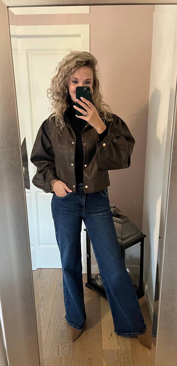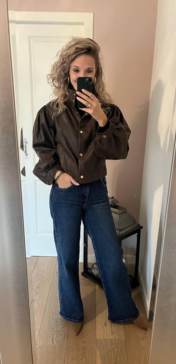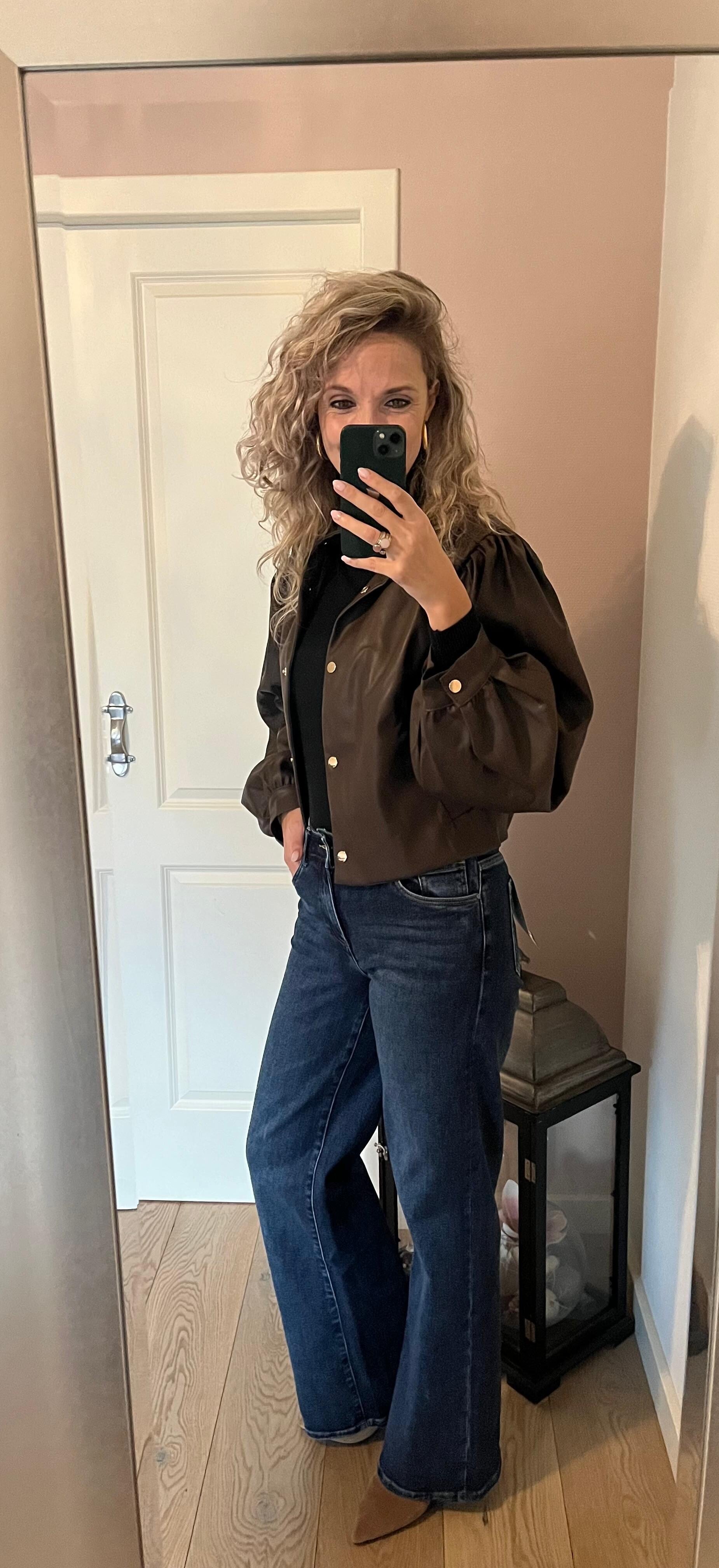 De donkere wassing van de jeans geeft een najaars gevoel, perfect voor de frisse dagen. De brede pijpen zorgen voor een flatterend silhouet en laten je benen langer en slanker lijken.