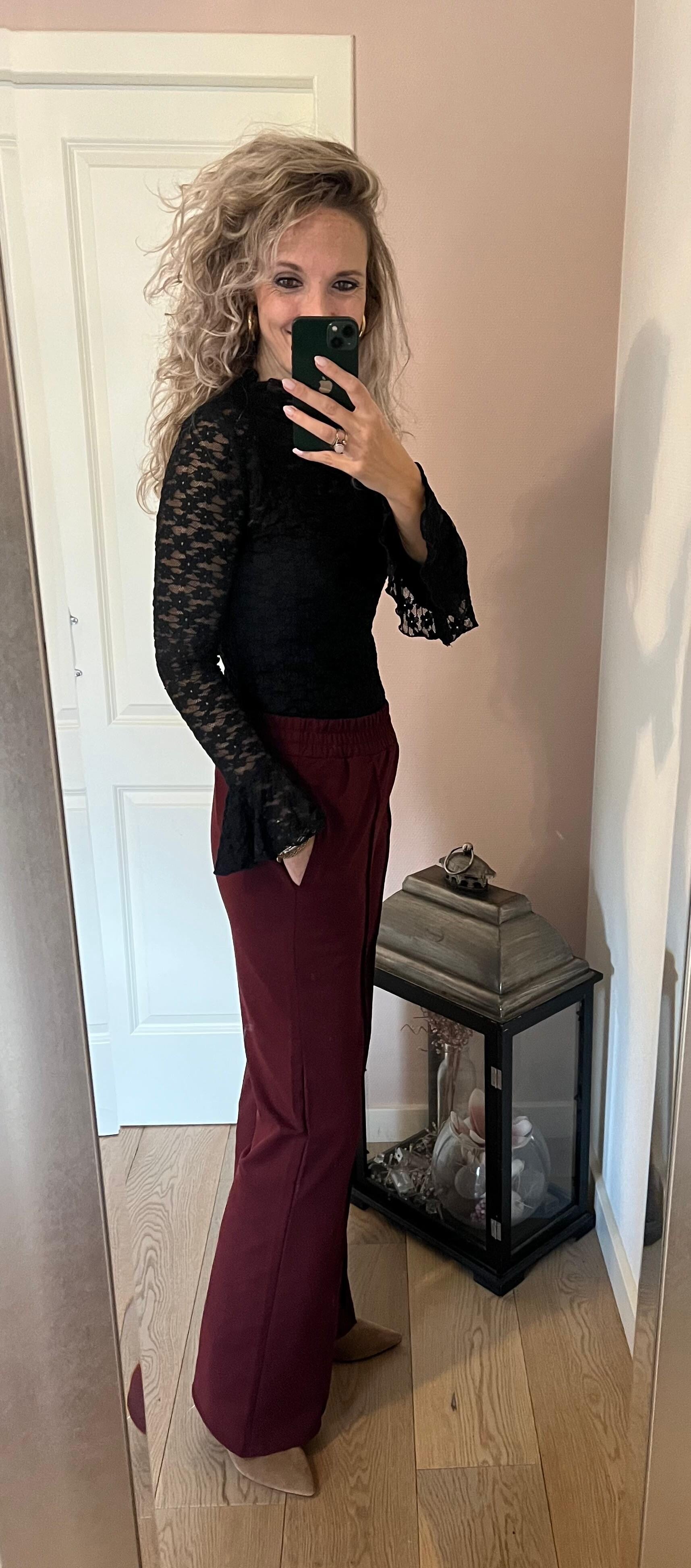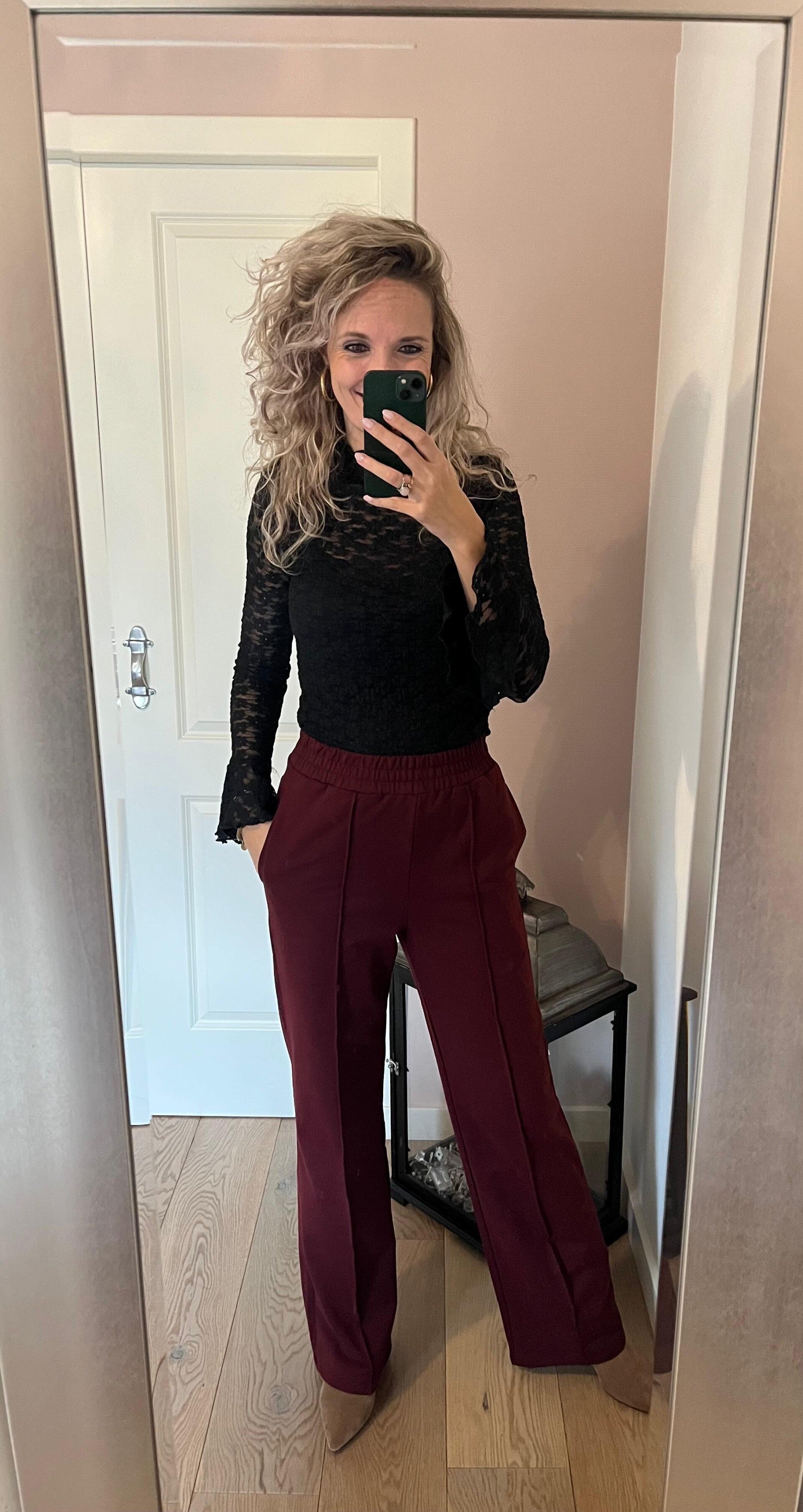 Deze heerlijke broek in de nieuwste najaarskleur van nu, bordeaux heeft een elastieken band aan de bovenzijde. Twee steekzakken aan de voorzijde. Deze broek gaat in de maten S/M M/L.
