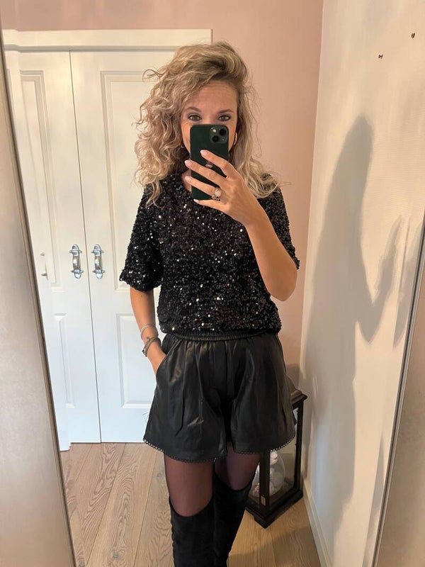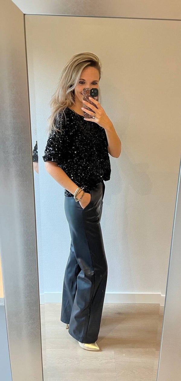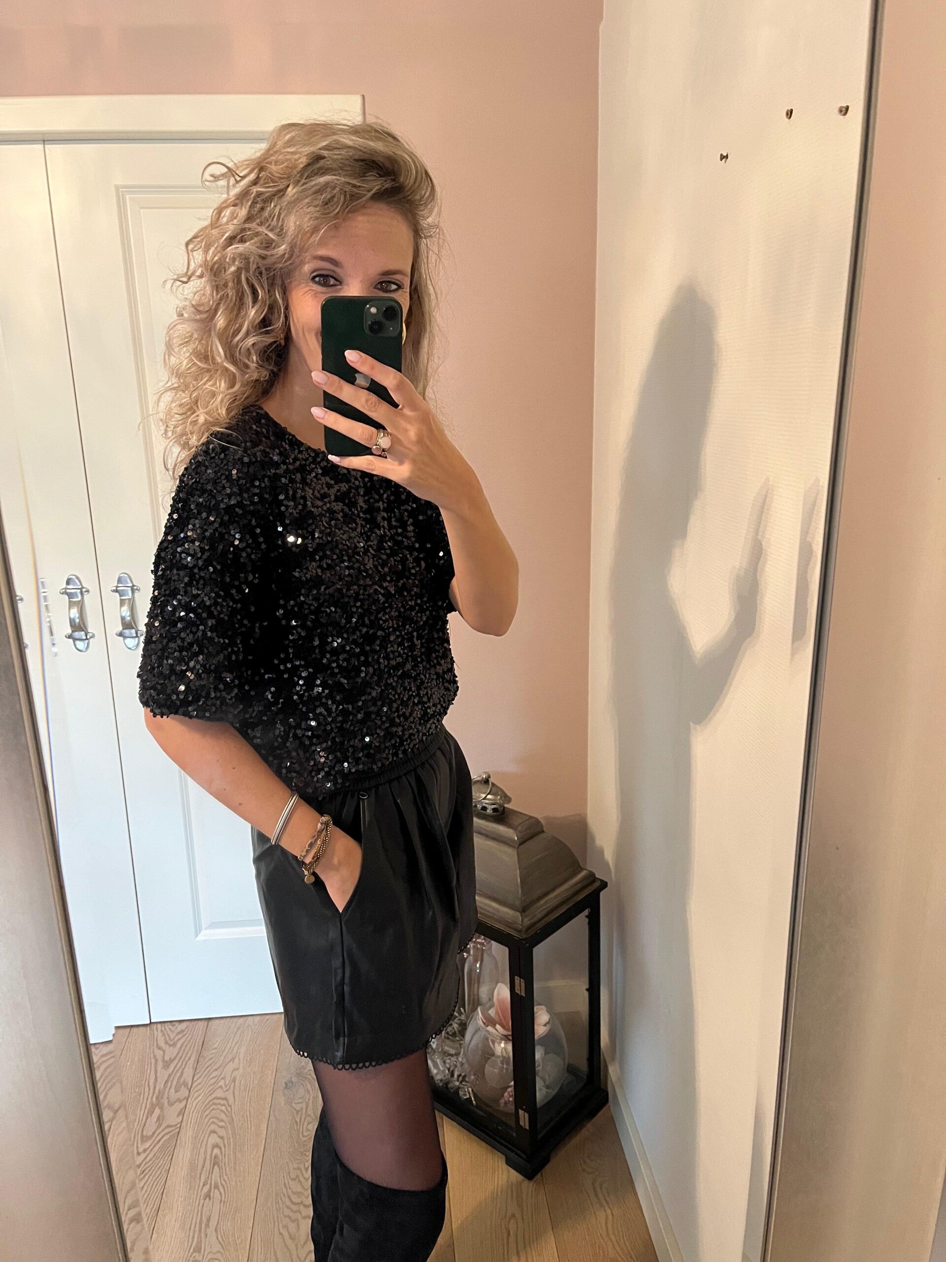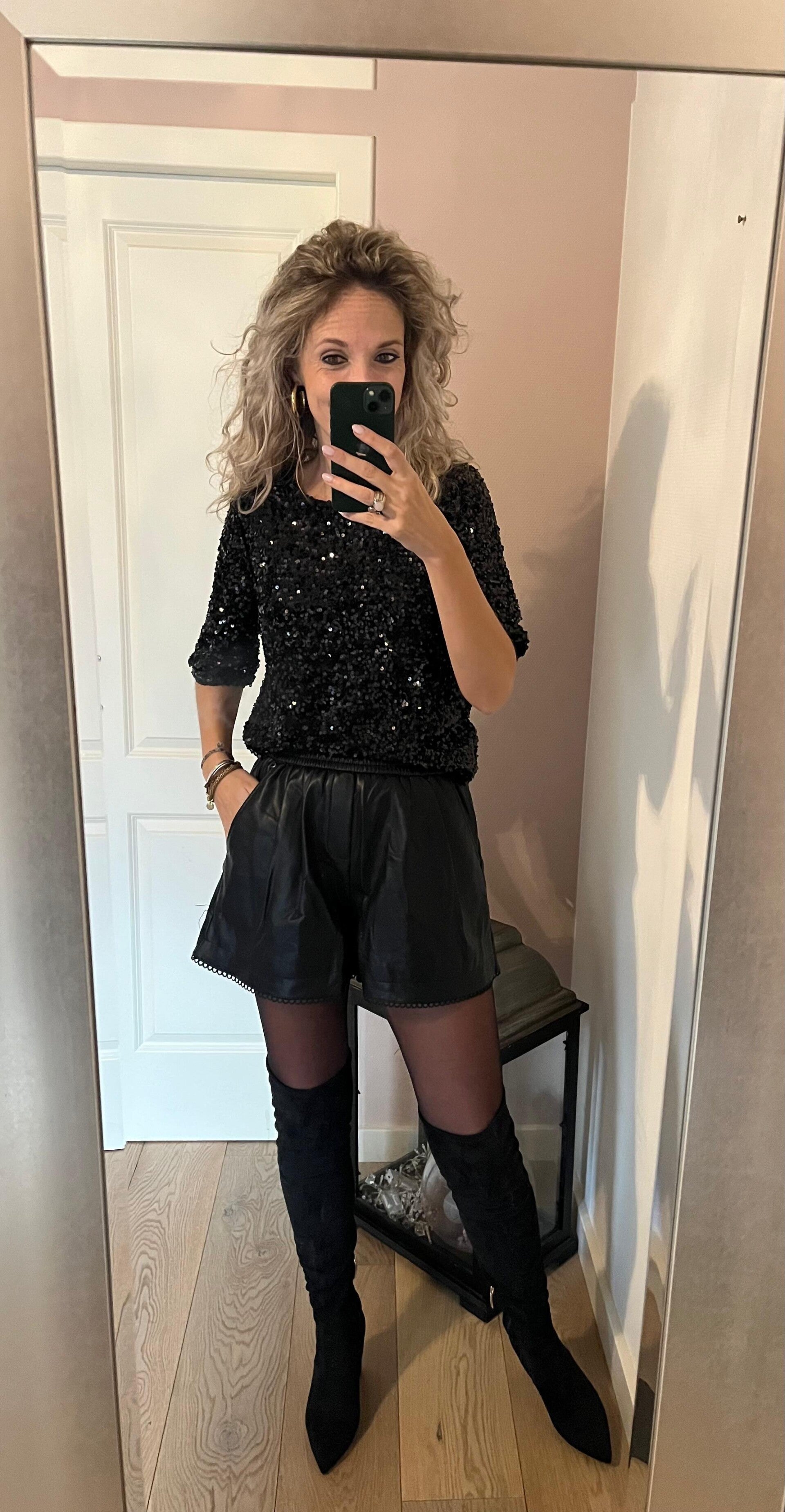Hoe gaaf is dit shortje. Leather look, twee steekzakken, elastiek in de taille. Gaaf met een ruime sweater maar ook zeker om netjes te dragen. Ons model draagt haar eigen maat.