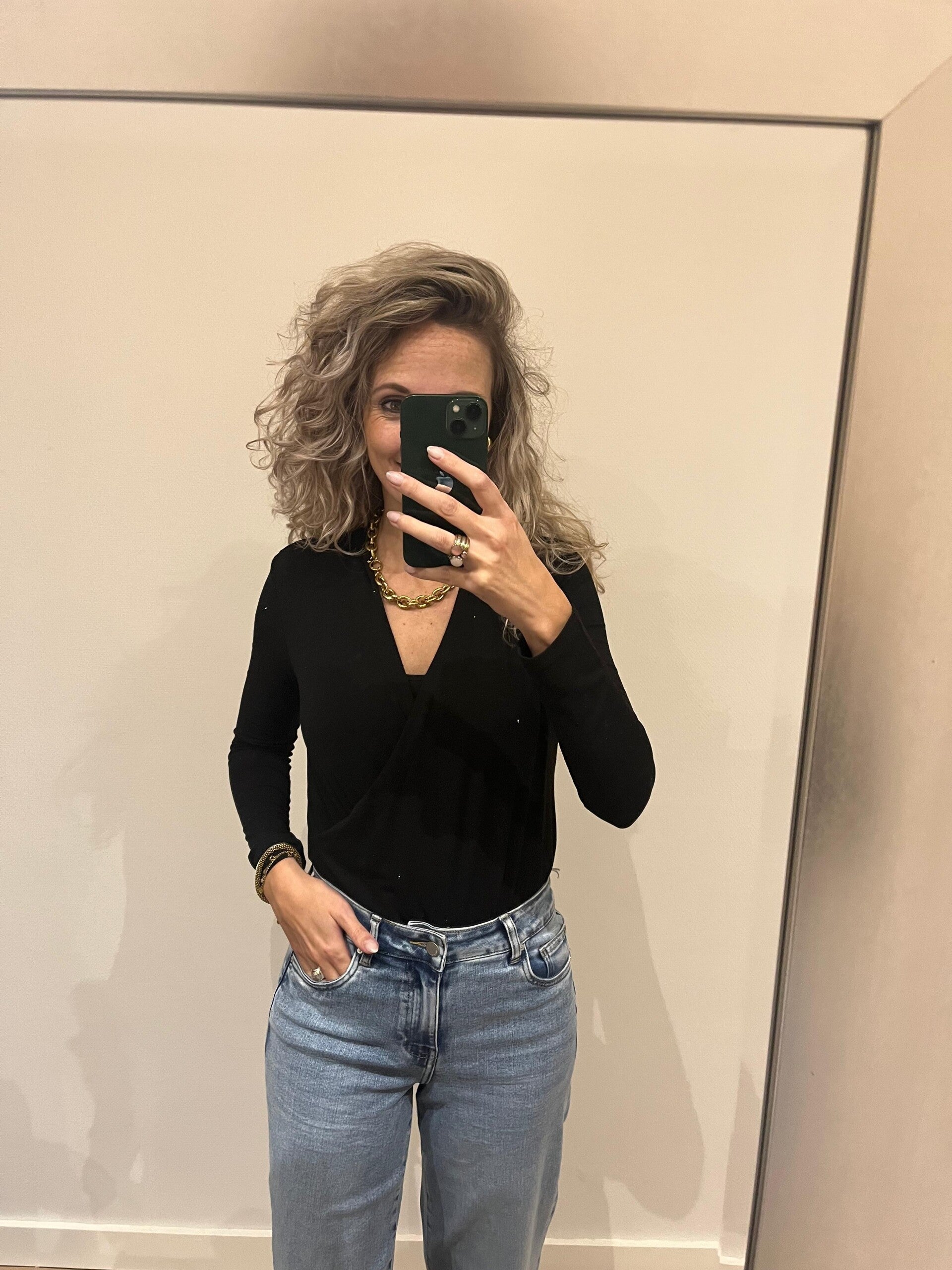 Deze body met overslag valt op maat. Ons model draagt maat S/M