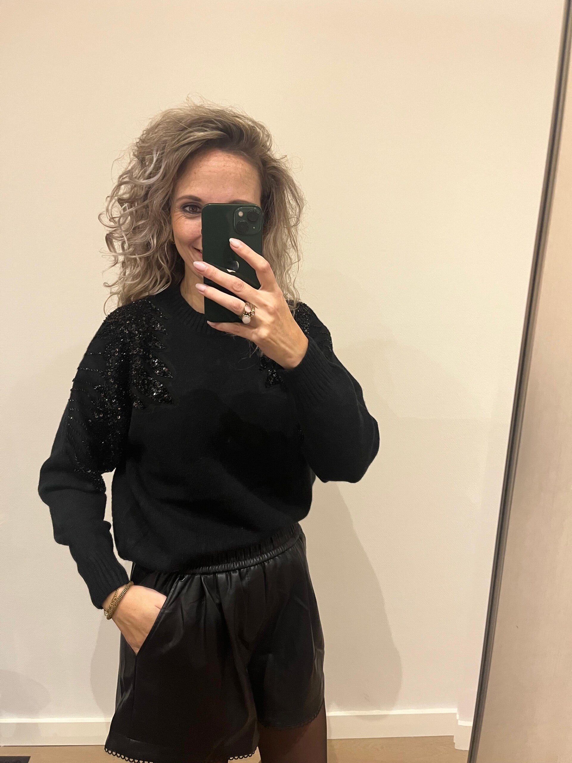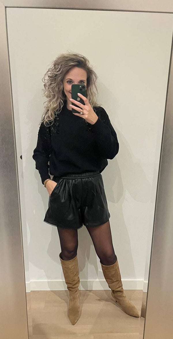 Hoe gaaf is dit shortje. Leather look, twee steekzakken, elastiek in de taille. Gaaf met een ruime sweater maar ook zeker om netjes te dragen. Ons model draagt haar eigen maat.