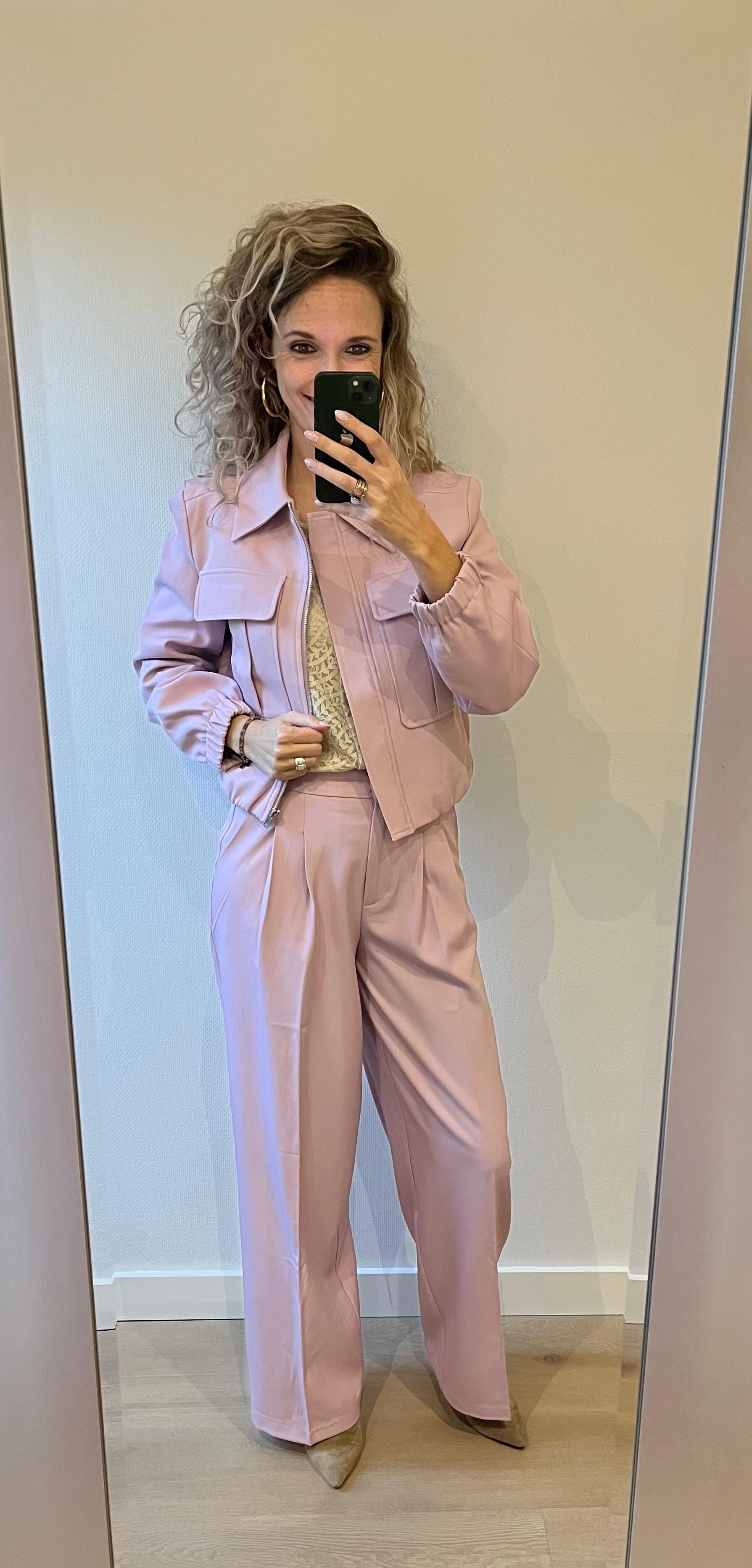 Dit leuke oud roze jasje is een korter model. Te sluiten met een rits en te dragen op de bijpassende pantalon of stoere jeans. Ons model draagt haar eigen maat