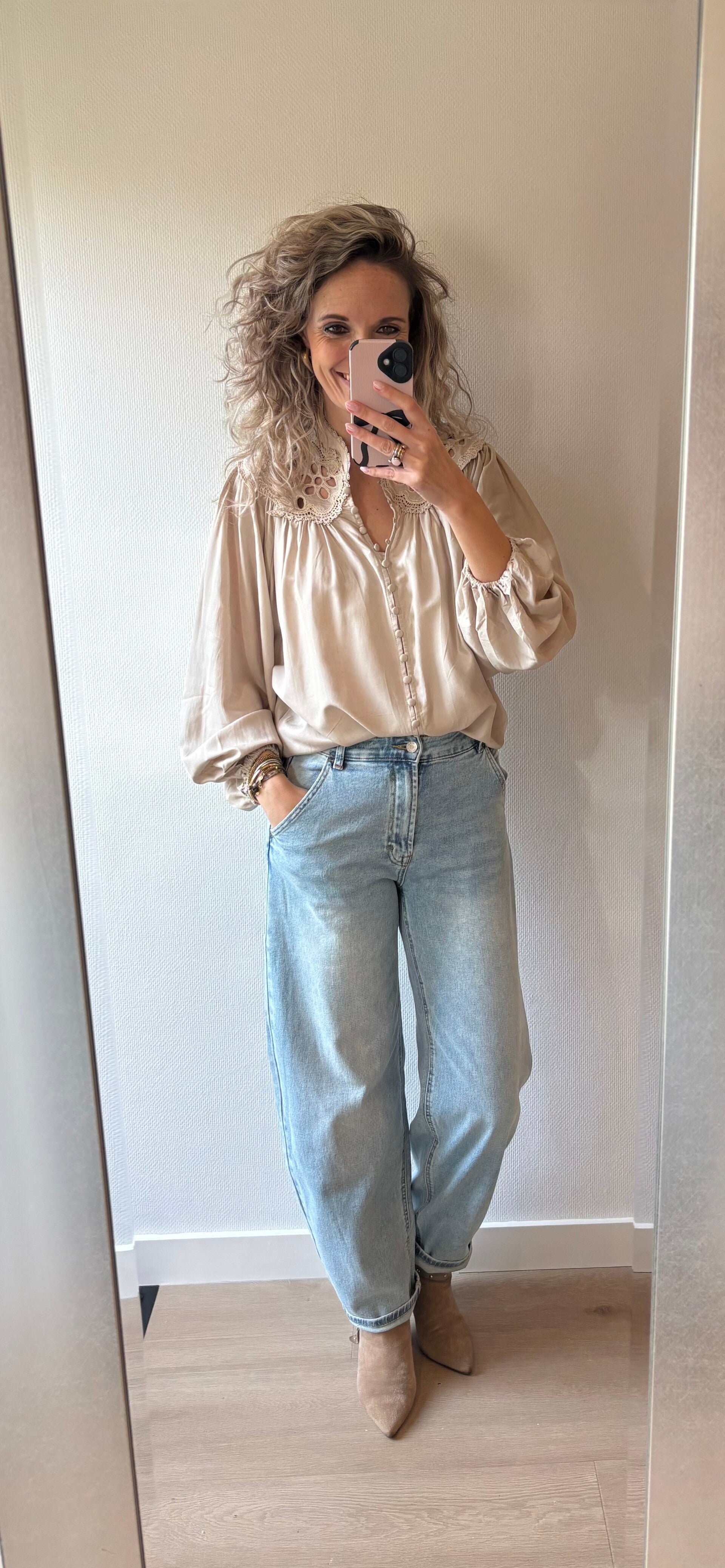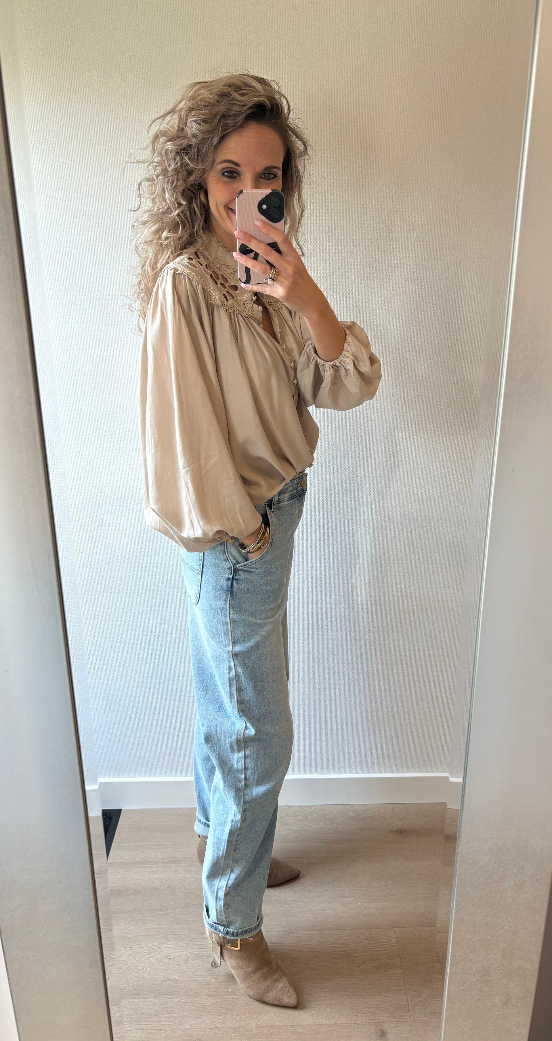 Deze blouse is mooi voor speciale gelegenheden maar ook zeer zeker leuk om op een jeans te dragen! De knoopjes zijn ook mooi gestoffeerd. Ons model draagt haar eigen maat, maat S/M
