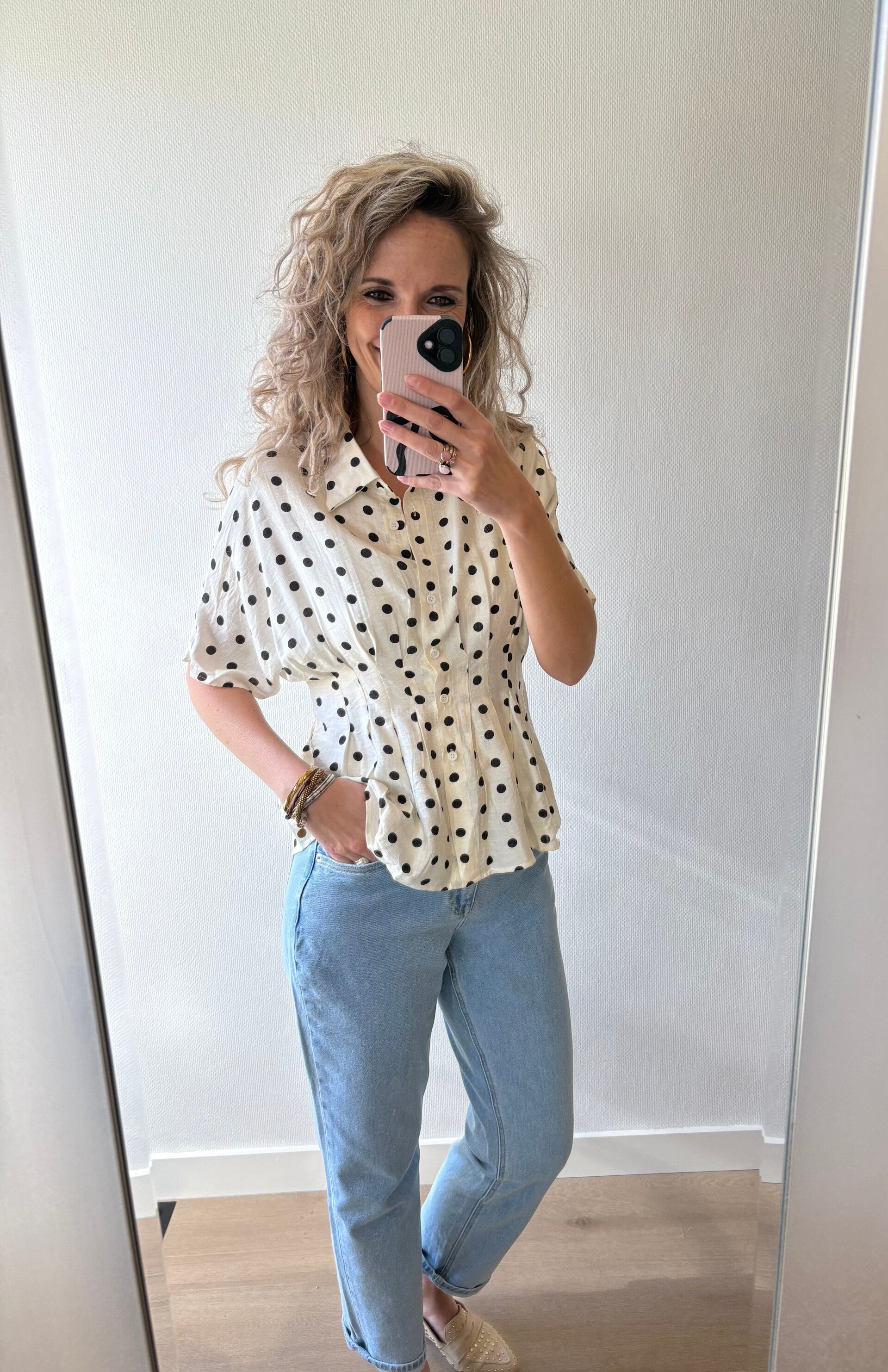 Dit mooie blousje is iets getailleerd, valt op maat. Ons model draagt maat S/M