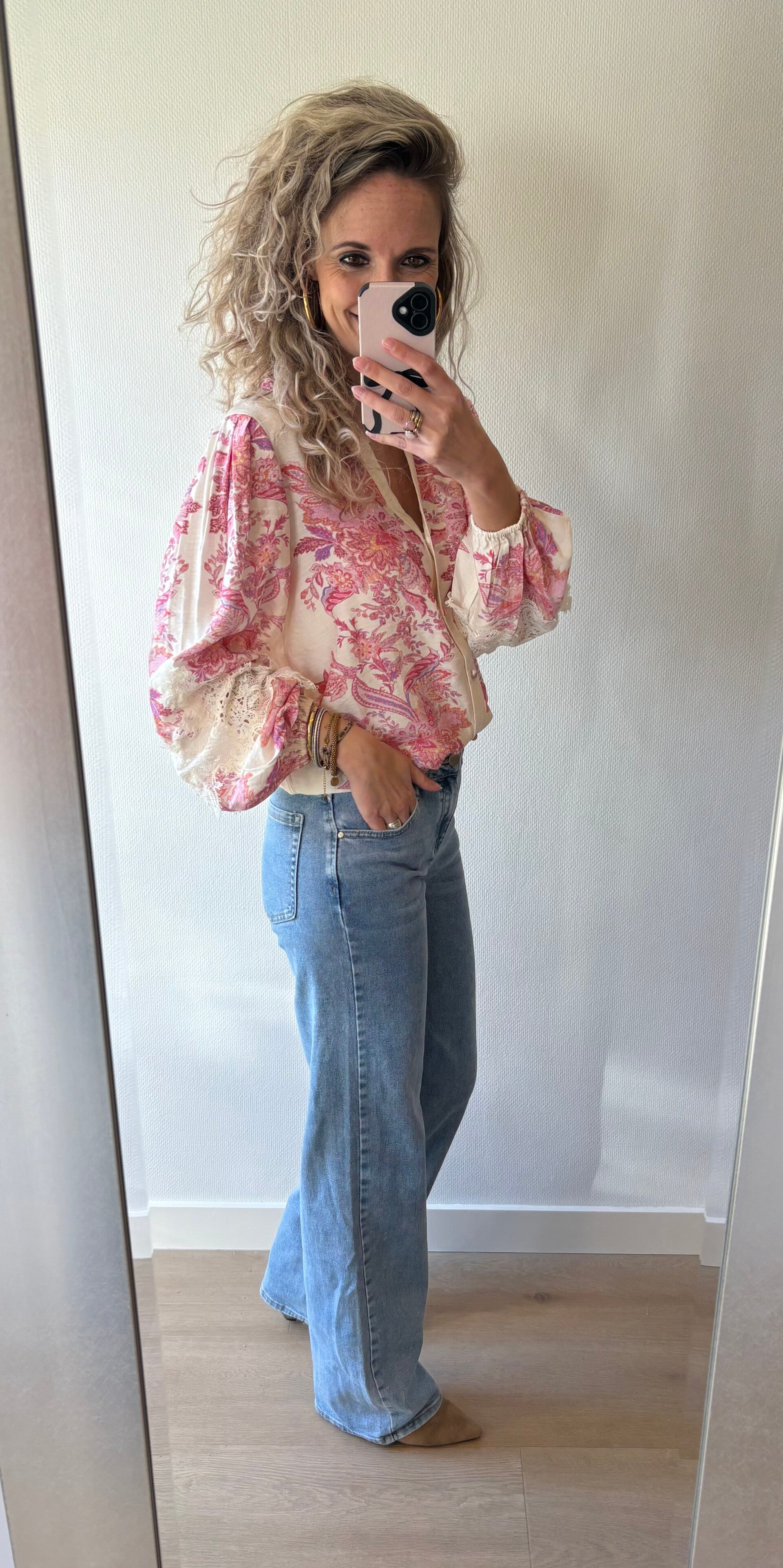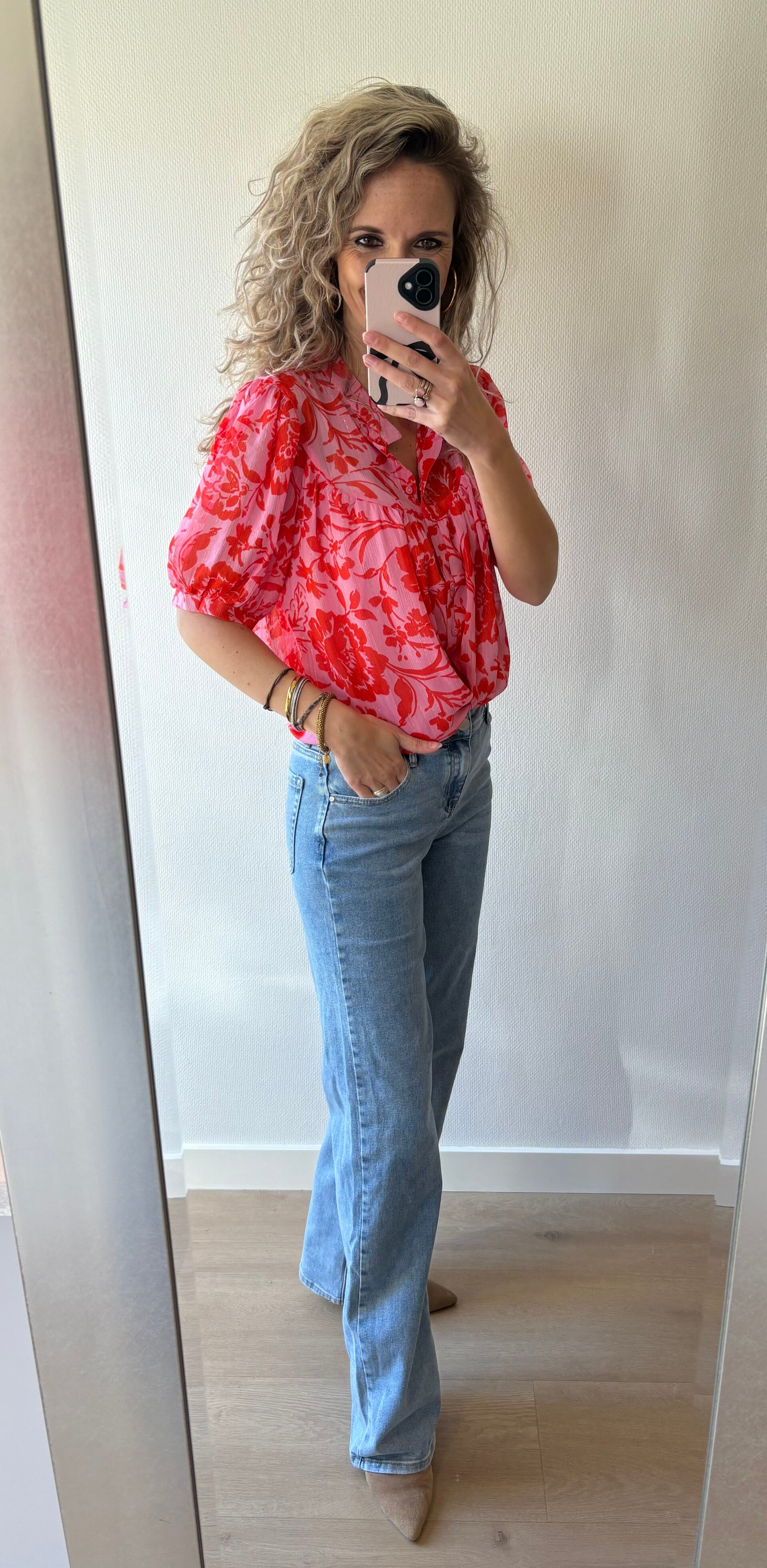 Deze mooie blouse valt iets ruimer. Ons model draagt maat S, haar normale maat.