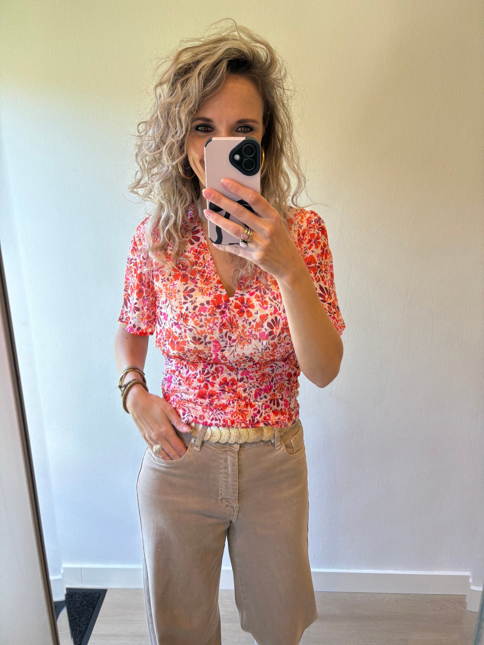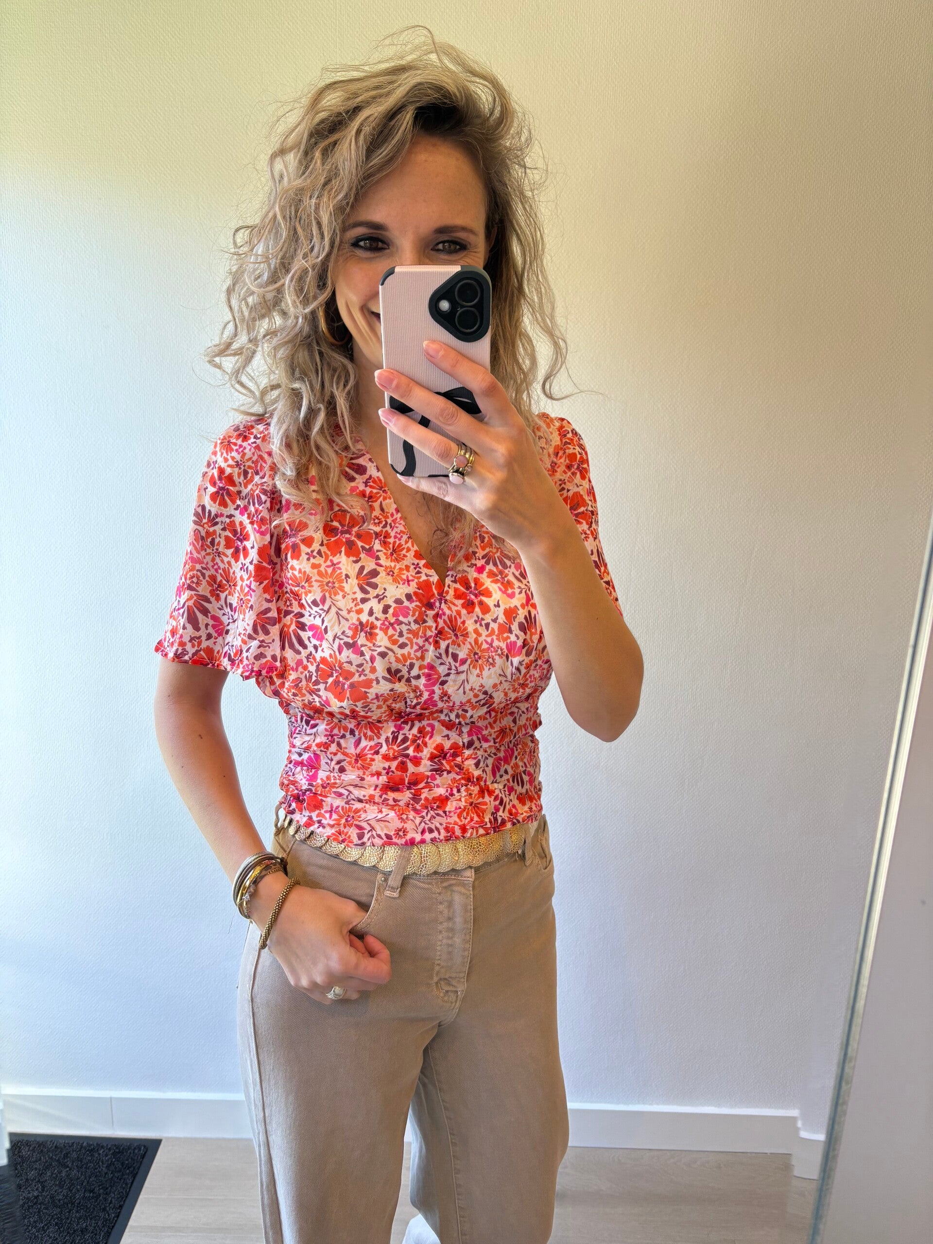 Deze mooie overslag top/blouse heeft elastiek in de rug waardoor het fijn draagt. De overslag zit vast.