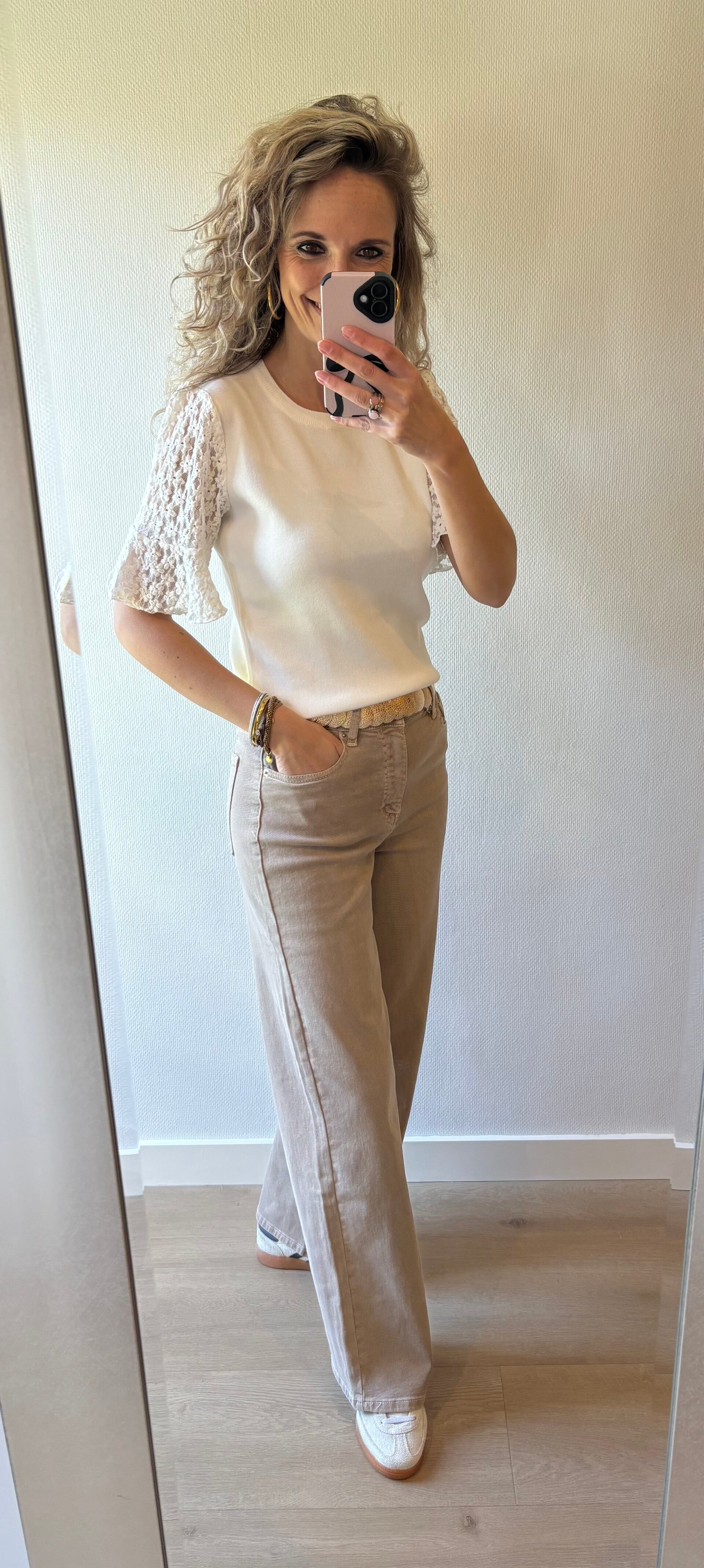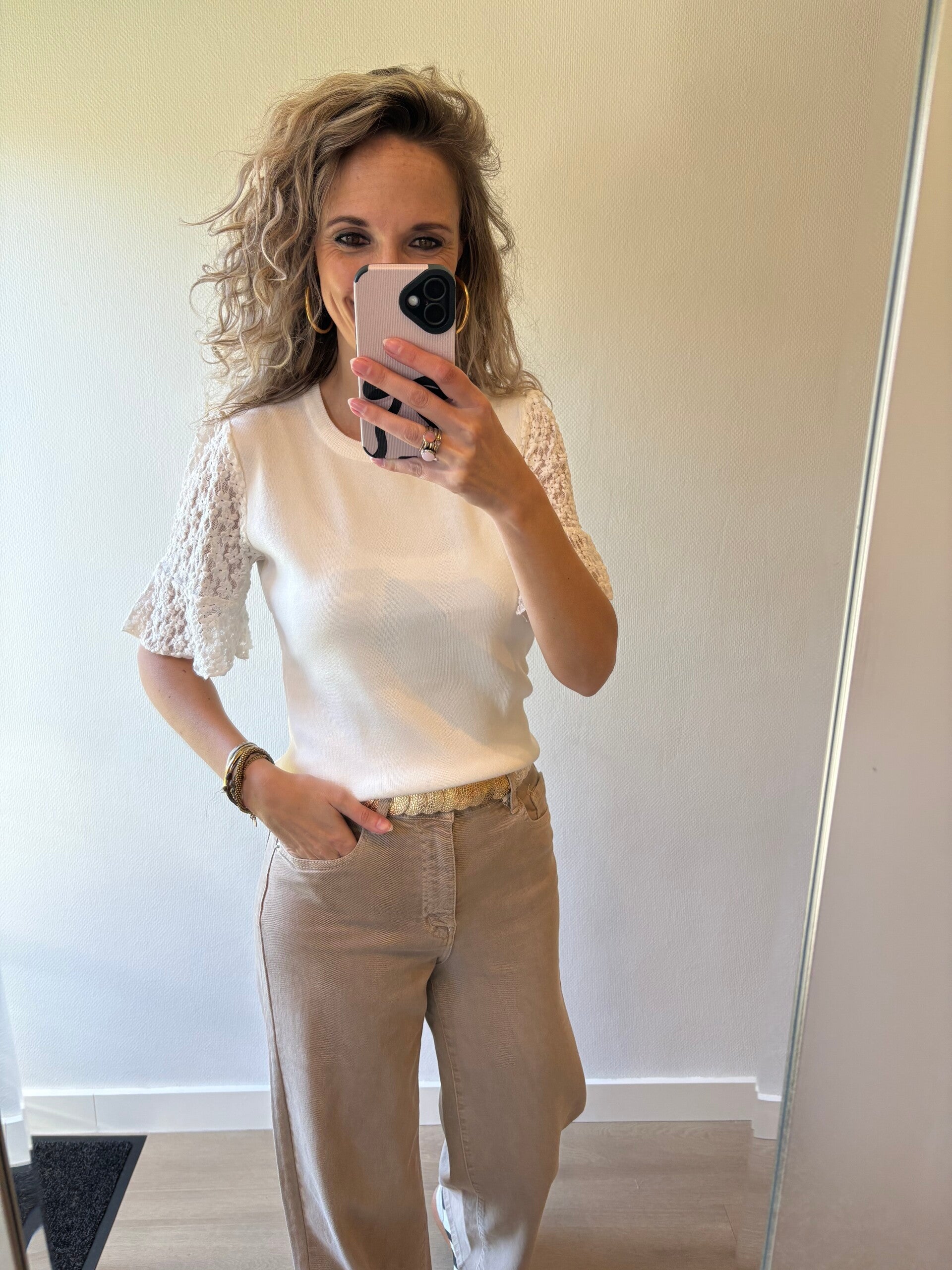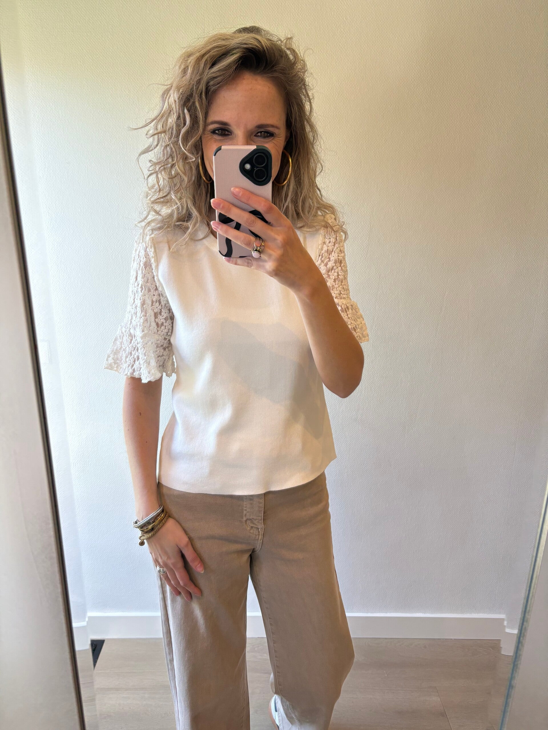 Deze mooie top heeft kanten mouwen en een mooie wat steviger tussenstuk. Ben je op zoek naar mooie witte top dan is dit de top voor jou!