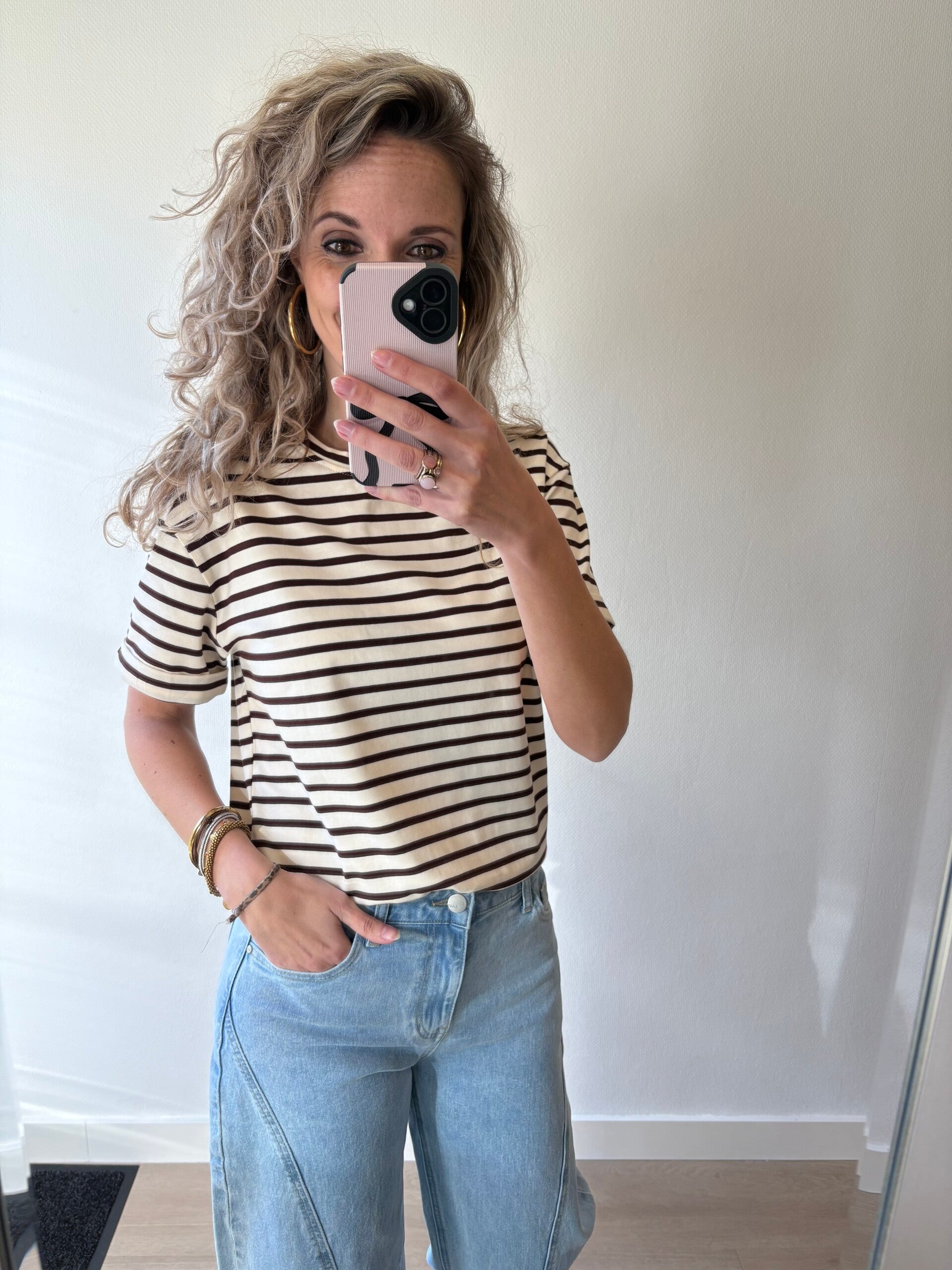 Deze makkelijke top met de kleurtrend bruin kan je overal bij combineren. De top valt op maat.