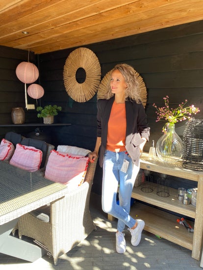 Deze zwarte blazer is een langer model. De mouw is driekwart.