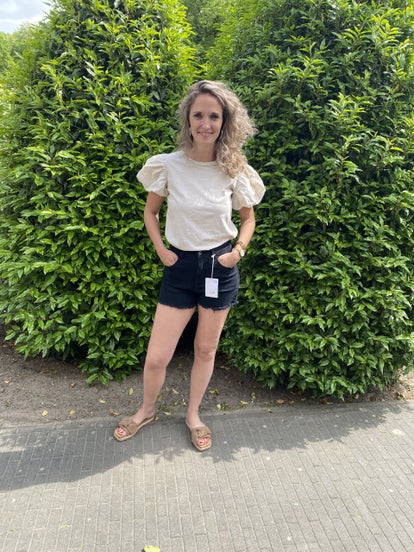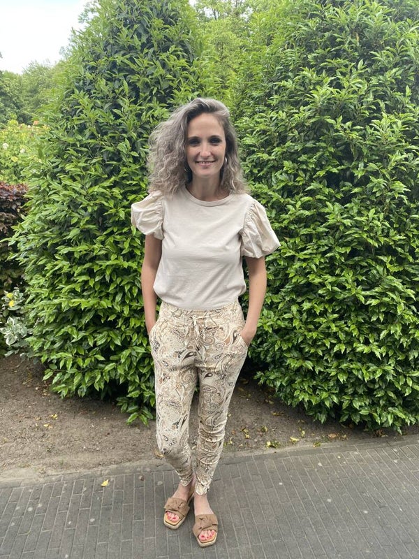 Deze top is van 100% katoen en in de maten S/M L/XL. Valt op maat. Leuk detail zijn de ballon mouwen.