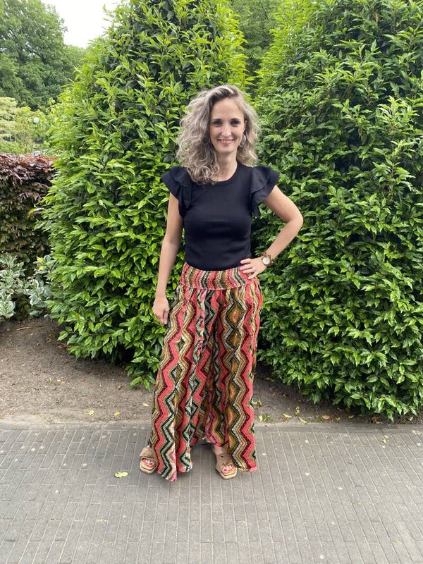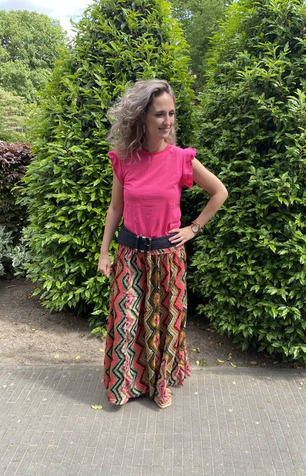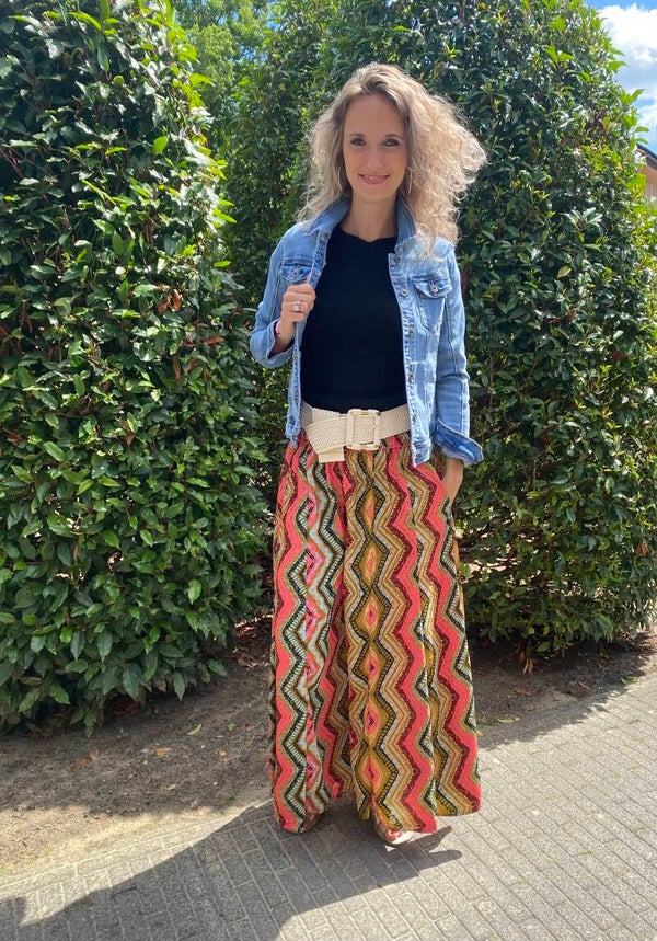 Deze super gave broek lijkt op een lange rok. Heeft twee zakken en draagt heerlijk. De broek is one size en te dragen t/m maat 42. Ons model is 1.73 cm