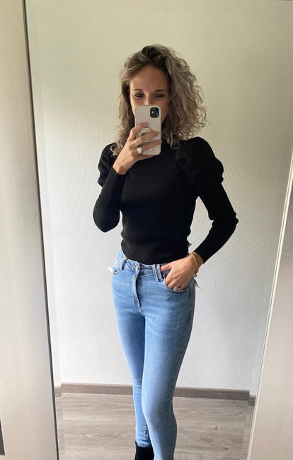 Deze zwarte coltrui heeft een pofmouw