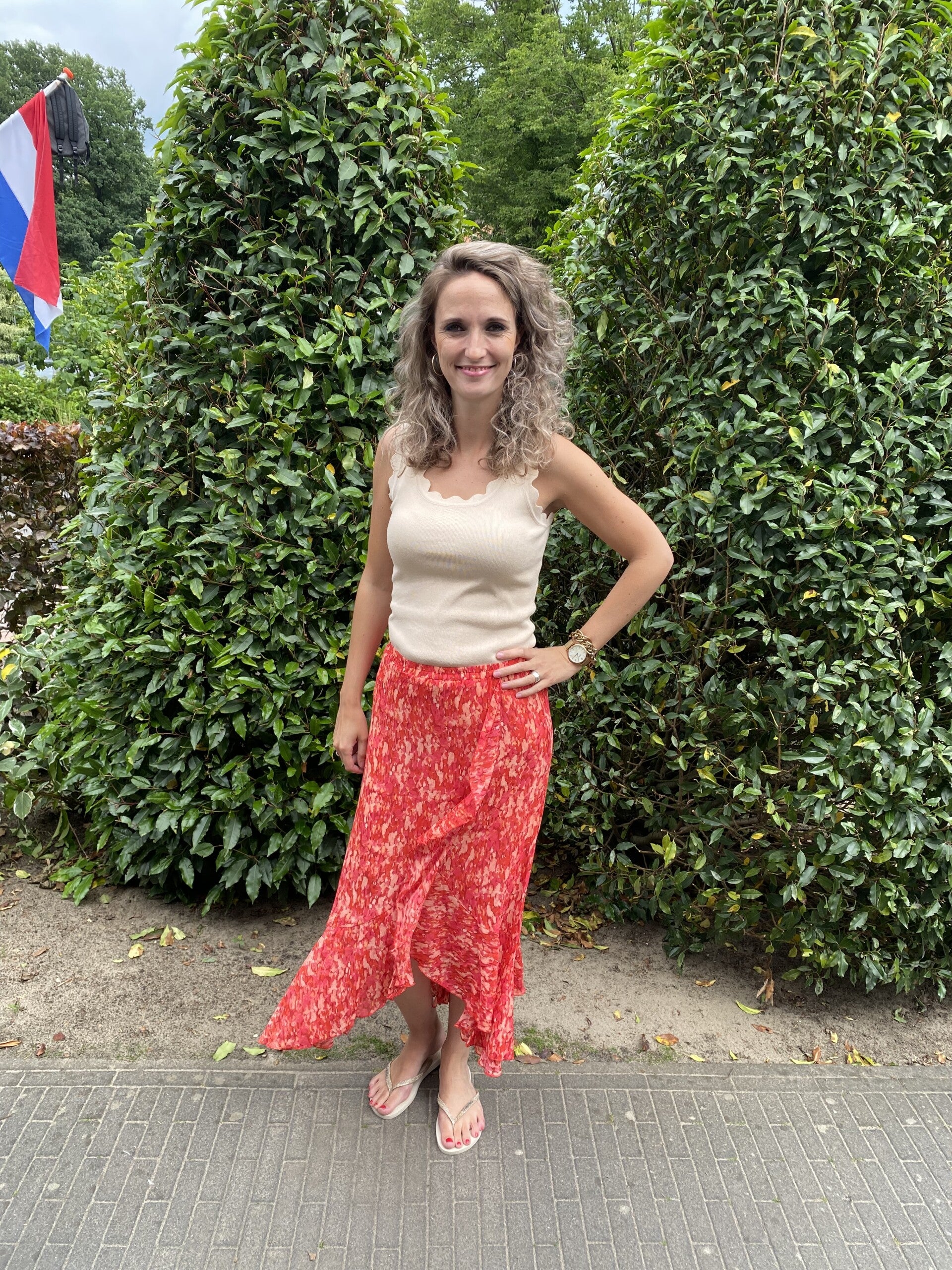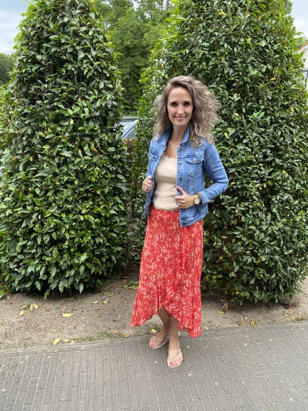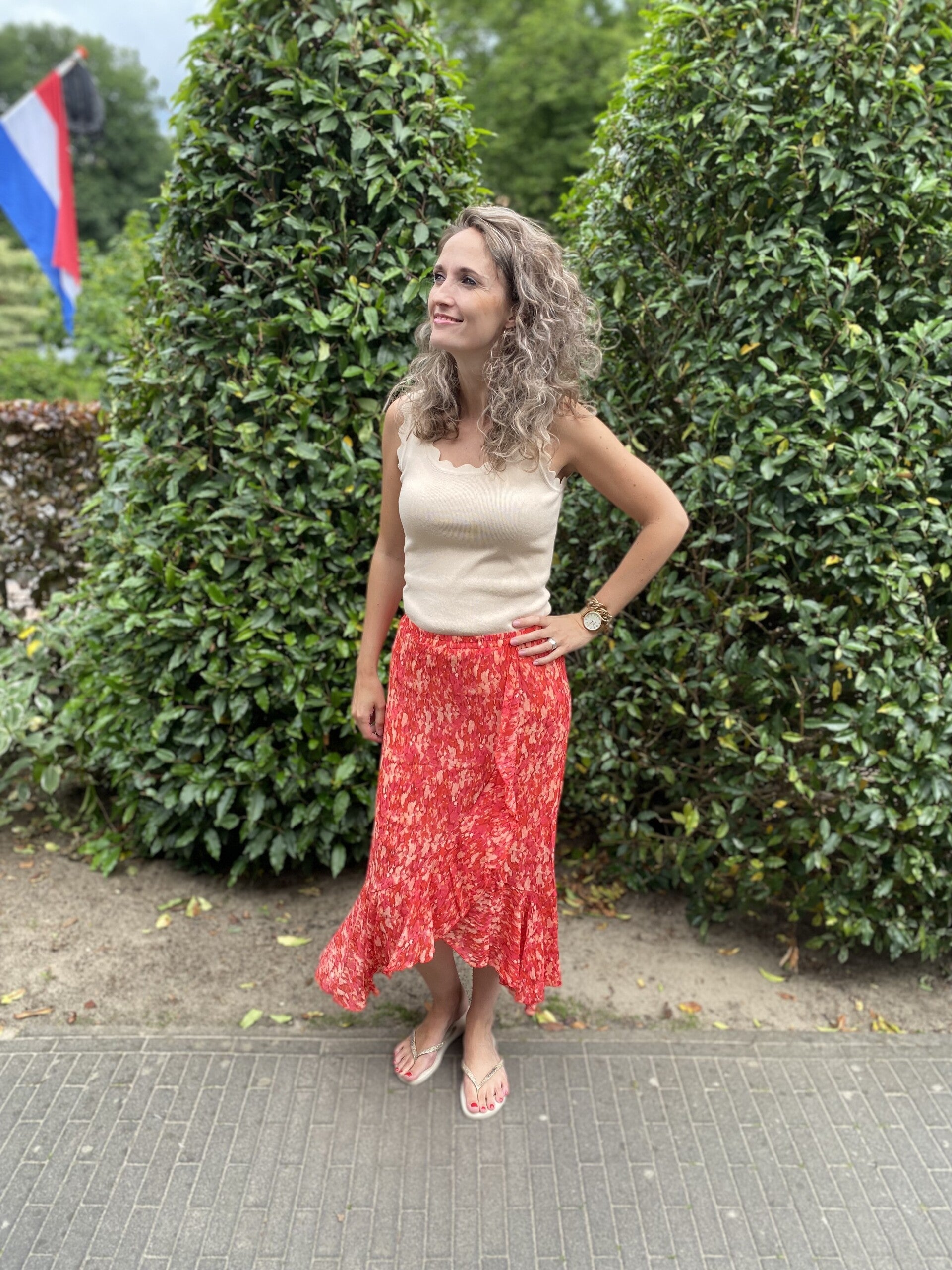 Deze super leuke rok gaat van maat S /L. Heeft een elastieken band aan de bovenzijde. De voorzijde is korter als de achterzijde. De overslag zit vast. Ons model draagt haar eigen maat.