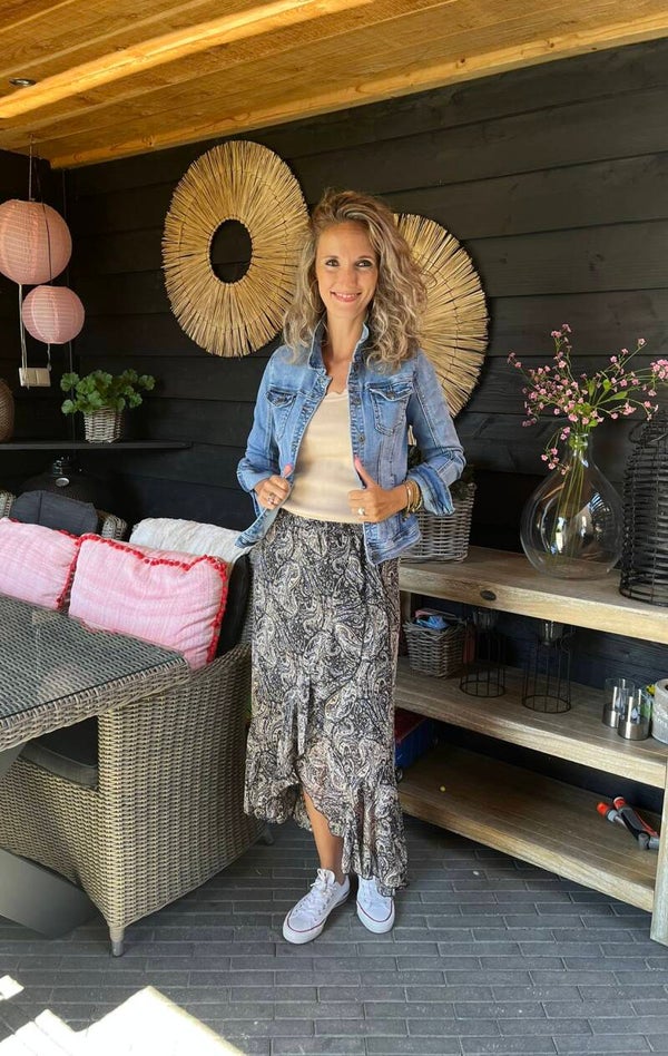 Deze leuke rok hebben wij in meerdere printjes. De voorzijde is korter als de achterkant. De overslag zit vast. De rok valt op maat.
